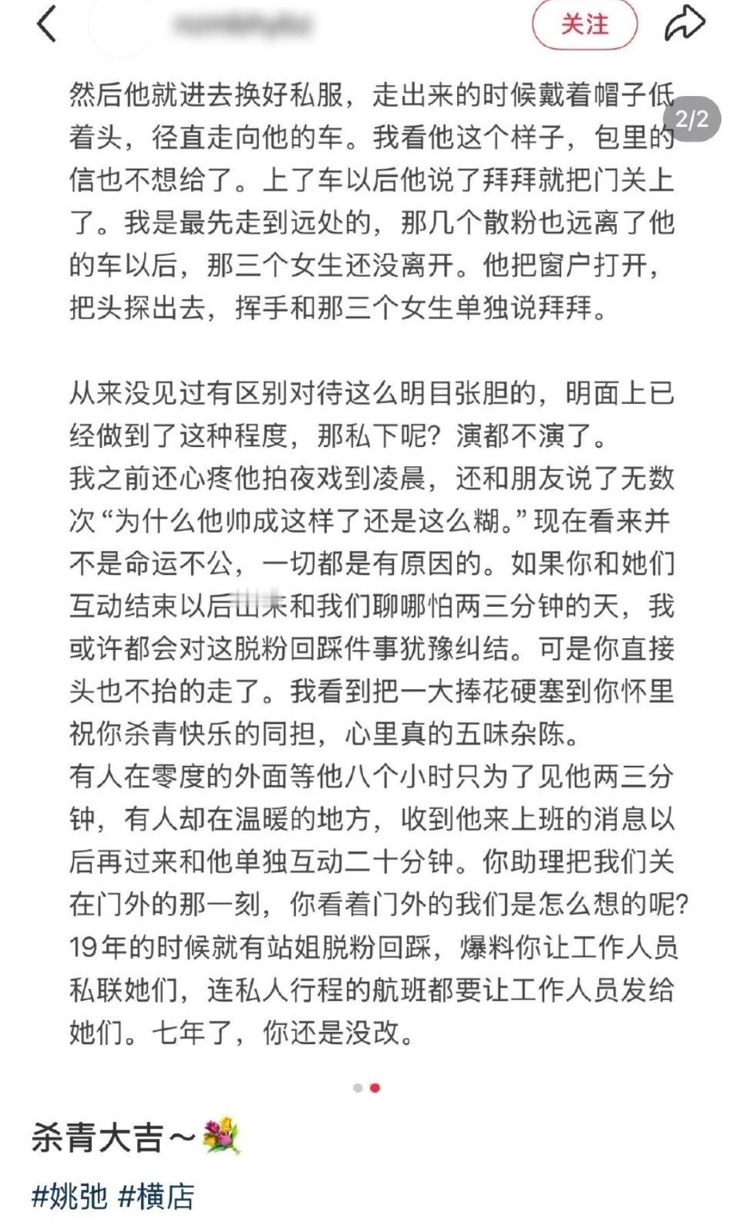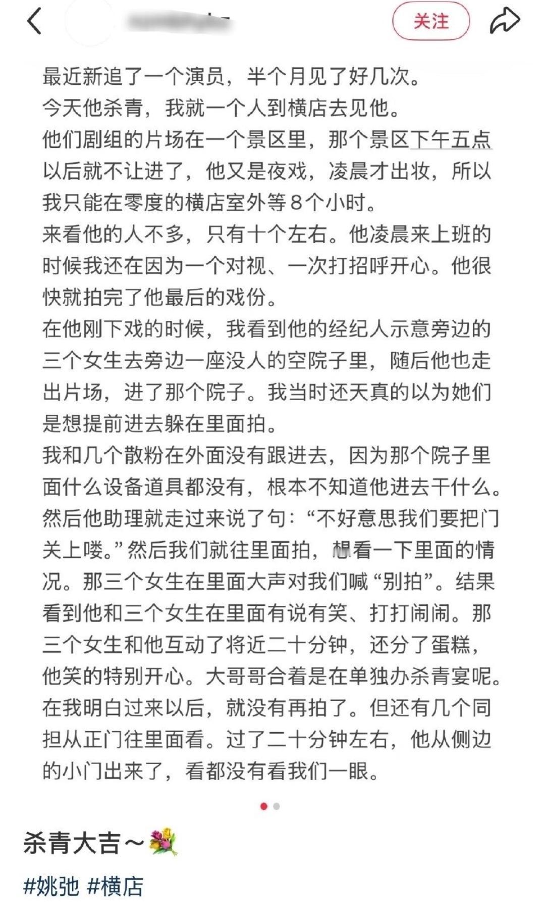 有网友爆料,盛世天下演员区别对待粉丝。 男演员杀青之后,不顾横店室外0度等了8个小时的十几个散粉,而是专门约了三个女生去了旁边一个没人的院子,单独办了杀青宴。 主演和三个女生在里边开开心心,打打闹闹,而其他粉丝则被关在院子外边,连看一眼都不让。 于是这个粉丝,道心崩溃了。 但问题是,我觉得主演这么做也没错吧?又不是他要求粉丝过去看的,他想跟谁办生日宴就跟办生日宴。 没准他跟三个女生关系好呢?