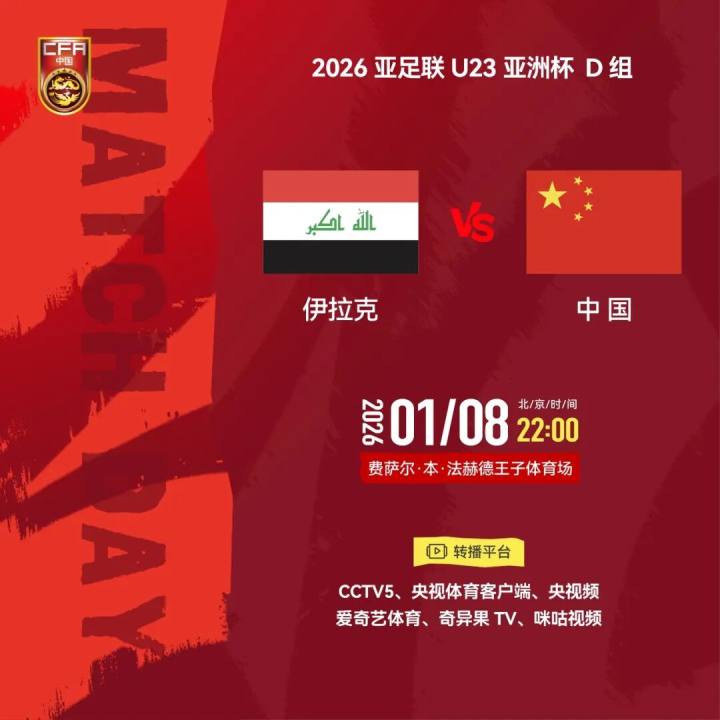 北京时间今日(1月8日)22时,U23男足亚洲杯,中国队将迎来小组赛首轮与伊拉克的较量,CCTV5将对赛事进行现场直播。