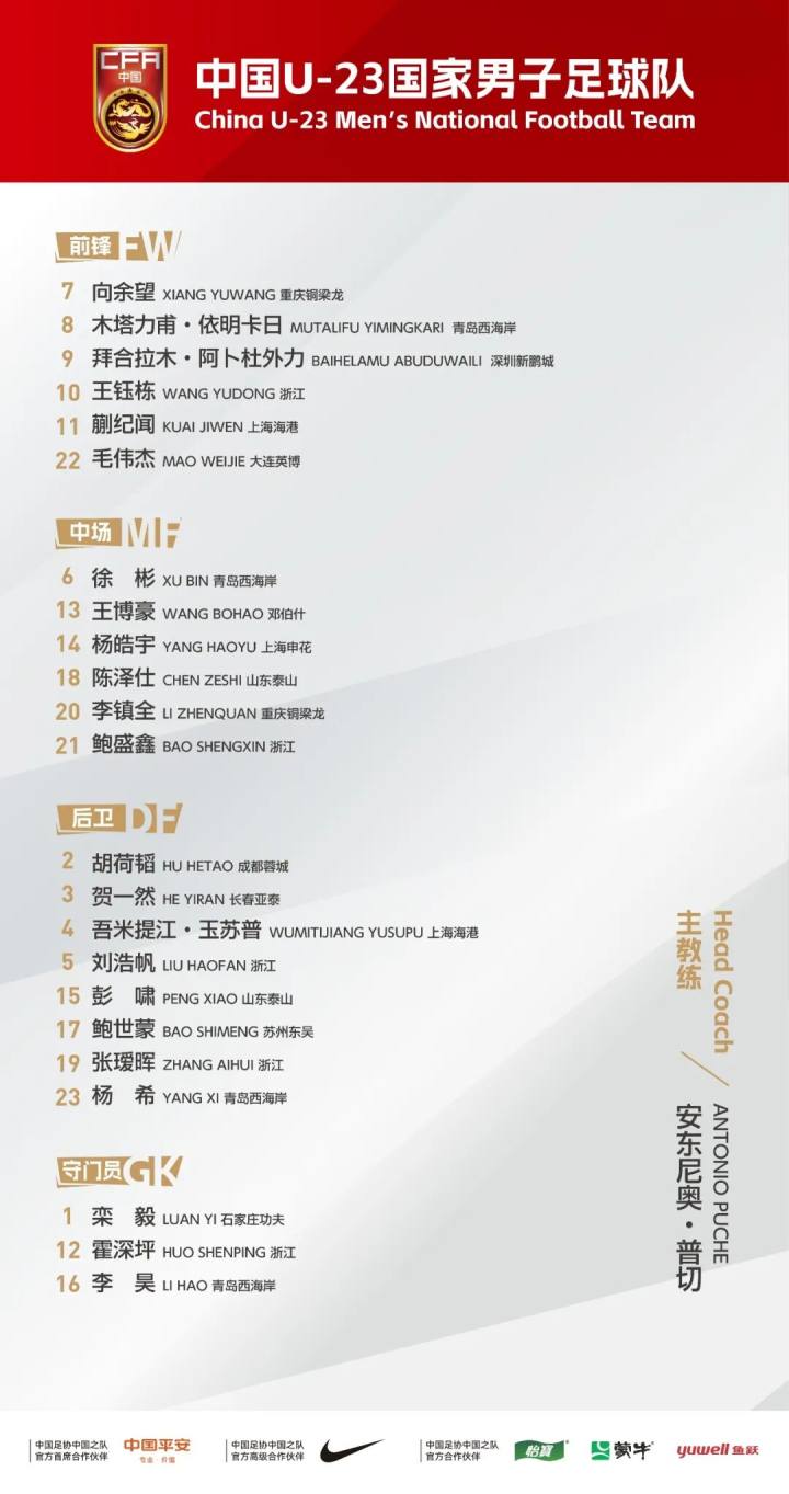 U23国足征战本届U23亚洲杯的23人参赛名单如下:
