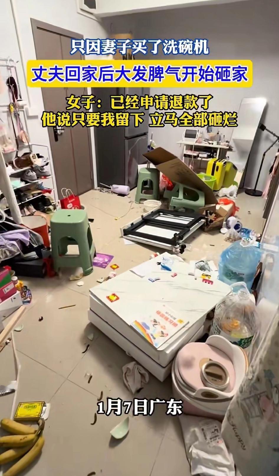 广东一男子只因妻子买了一个洗碗机,回到家大发脾气,把家都砸了。女子:已经申请退款