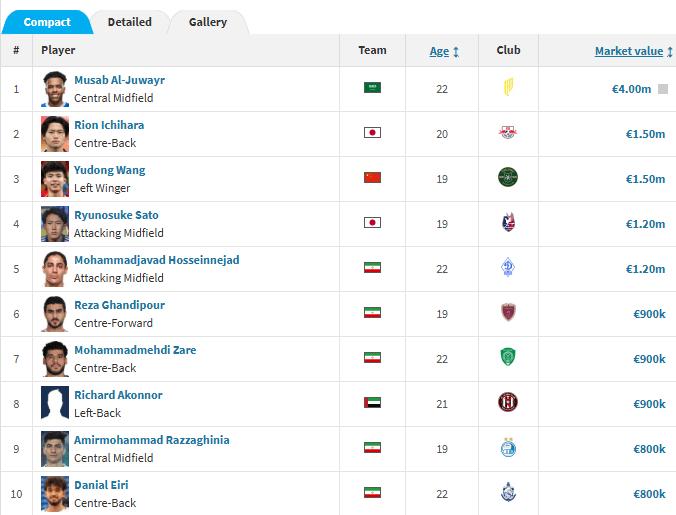 本次身价榜冠军为沙特中场朱维尔,他身价高达400万欧元。王钰栋和日本后卫市原吏音身价均为150万欧元并列第二;胡荷韬70万欧元排名第12,向余望和刘浩帆身价均为50万并列第20。