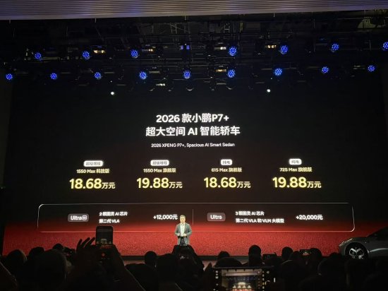 新浪科技讯1月8日下午消息,2026小鹏全球新品发布会举行。会上,2026款小鹏P7+发布,超级增程1550Max科技版售价18.68万元,1550Max旗舰版售价19.88万元。