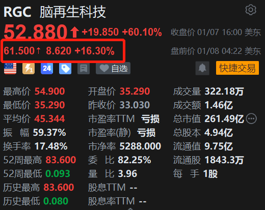 脑再生科技(RGC.US)美股盘前继续上涨16.3%,此前3日累计飙涨高达157%。消息上,马斯克日前“量产预告”催化,导致脑机接口概念大爆发。据悉,脑再生科技与脑机接口的关系,可以理解为医学上“修复硬件”与“建立连接”的上下游关系。长江证券研报指出,当前,我国脑机接口产业成果频出。政策扶持下,脑机接口产业有望迎来发展机遇期,并加速由产业研究向商业化转化,进而加速脑机接口大规模商业化落地进度。