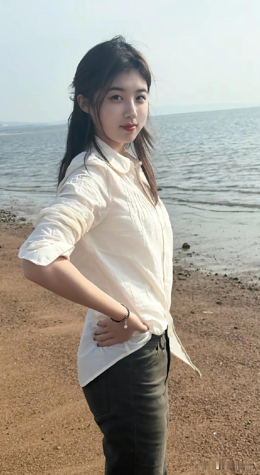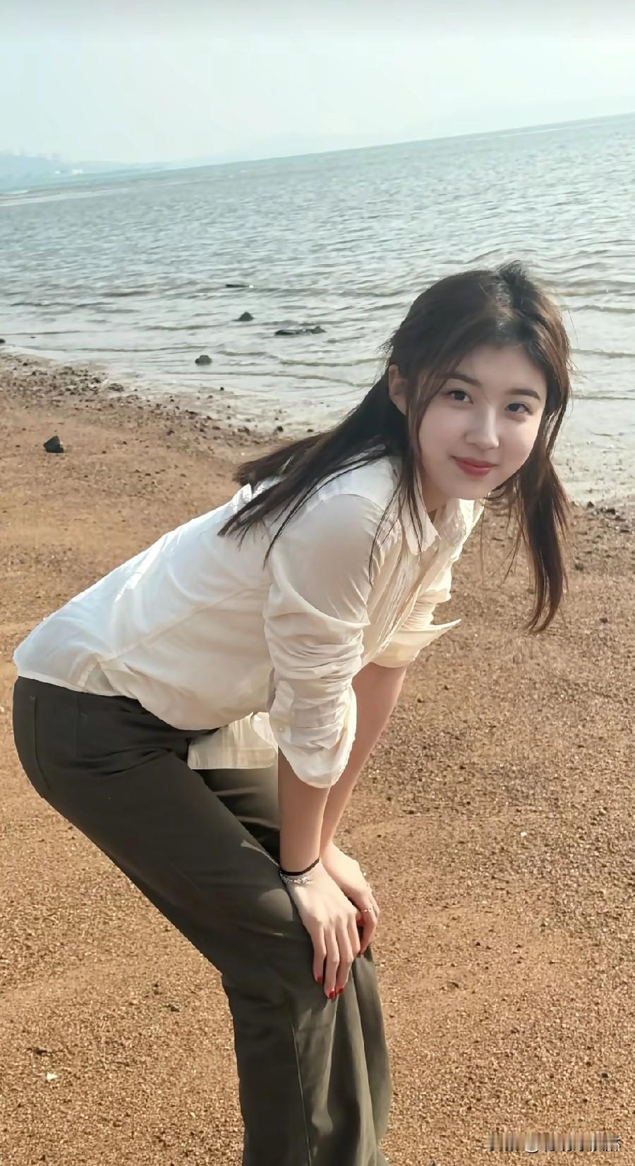 海边女孩弯腰拍照,笑容甜美。