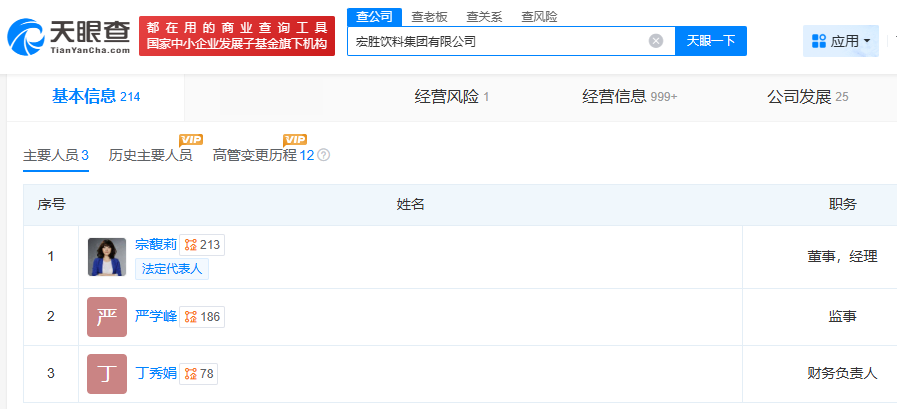 天眼查显示,2025年12月26日,宏胜饮料集团有限公司法定代表人再次发生变更,由“郑群娣”变更为“宗馥莉”。同时,宗馥莉还担任董事和经理,完成了对这家核心企业的全面掌控。