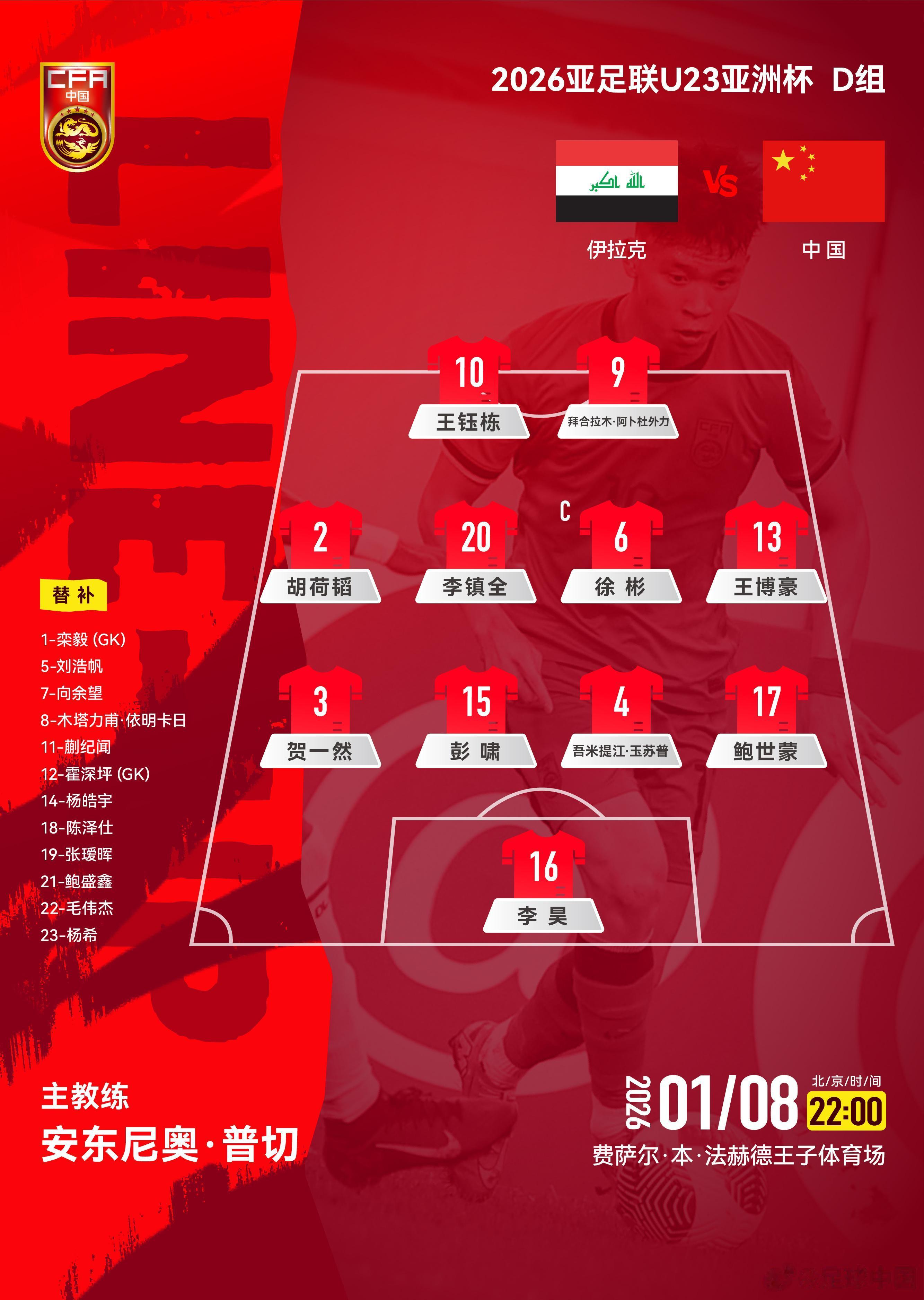 虎扑01月08日讯U23亚洲杯小组赛首轮,中国U23对阵伊拉克U23,比赛将于北京时间今晚22:00开始,赛前中国队公布了首发阵容(4-4-2阵型)。