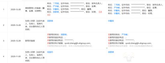 天眼查显示,2025年12月份,宏胜饮料集团有限公司法定代表人由郑群娣变更为宗馥莉,高级管理人员备案也发生变更,郑群娣不再任经理,变更后宗馥莉同时担任公司董事和经理,联络员备案也由郑群娣变更为严学峰。