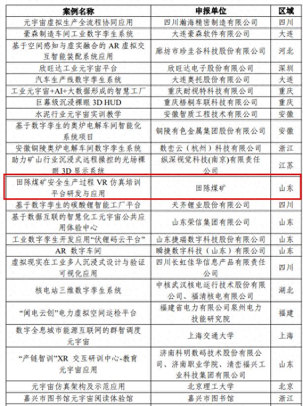 近日,国家工信部对2025年元宇宙典型案例评选结果进行了公示,其中,枣庄矿业(集团)有限责任公司田陈煤矿申报的“田陈煤矿安全生产过程VR仿真培训平台研发与应用”项目成功入选公示名单。