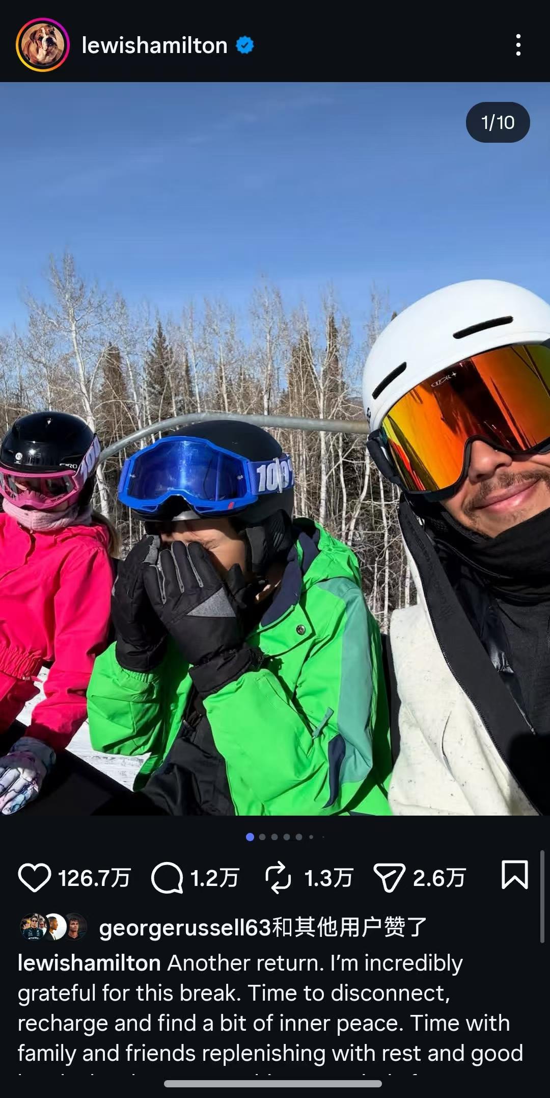 这位英国车手在进入冬歇期时曾宣称,自己将远离手机和社交媒体,让旁人无法联系到自己。然而,生日之际他打破沉默,分享了与家人共度时光的照片。这位七届世界冠军在社交媒体上写道:“再度回归。我无比感激这次休假。是时候断开联系、重振精神、寻回内心的一丝宁静了。”