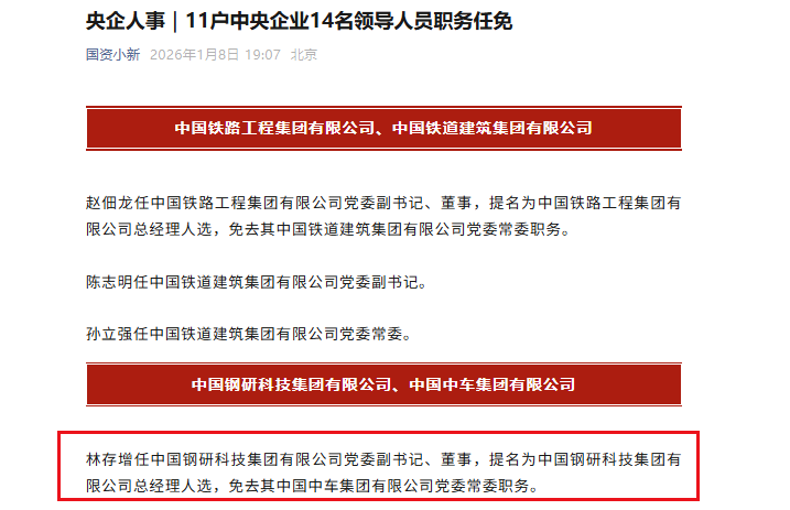 2026年1月8日,国资小新发布消息《央企人事|11户中央企业14名领导人员职务任免》,其中,林存增任中国钢研科技集团有限公司党委副书记、董事,提名为中国钢研科技集团有限公司总经理人选,免去其中国中车集团有限公司党委常委职务。