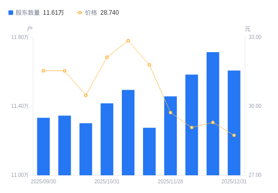 日期A股户数(户)流通A股户均持股数(股)户均持股市值(万元)2025-12-311160784674.8513.442025-12-191171454632.2713.572025-12-101158474684.1713.622025-11-281145794736.0114.082025-11-201127544812.6615.312025-11-101149574720.4415.512025-10-311141774752.6815.282025-10-201130214801.2914.632025-10-101134614782.6815.092025-09-301133374787.9115.11