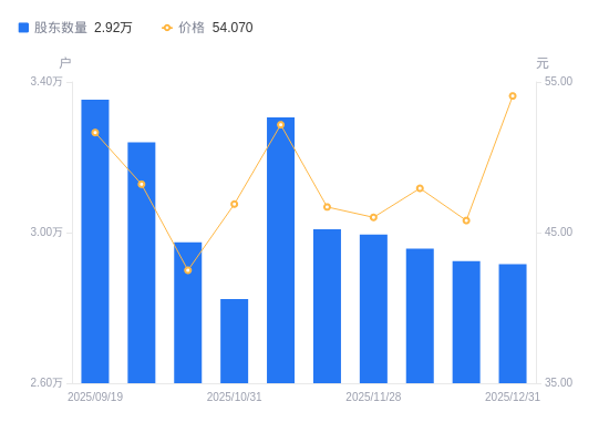 日期A股户数(户)流通A股户均持股数(股)户均持股市值(万元)2025-12-31291616255.7933.832025-12-19292446238.0428.572025-12-10295706169.2729.582025-11-28299466091.8128.032025-11-20300896062.8528.312025-11-10330615517.8428.782025-10-31282366460.7330.292025-10-20297446133.1826.072025-09-30323975630.9327.152025-09-19335305440.6628.10