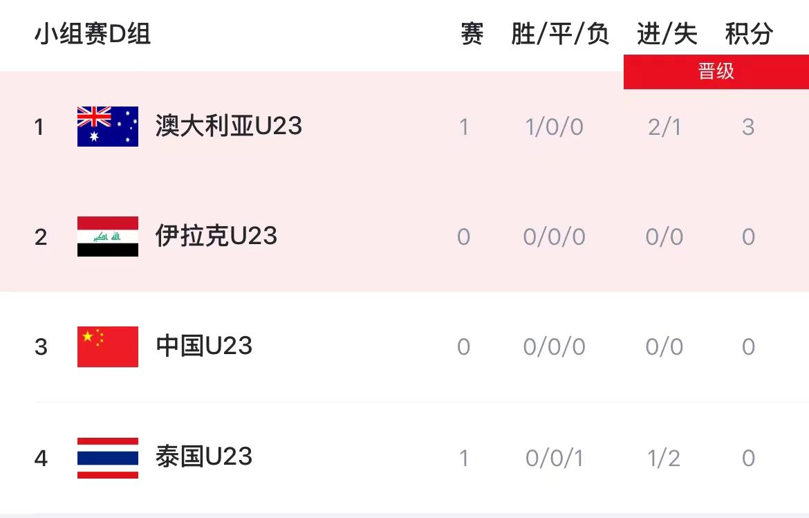目前积分榜上,澳大利亚凭借首轮的胜利积3分高居小组榜首;伊拉克紧随其后积1分排名第二;中国队同样积1分,但因本场比赛黄牌数多于伊拉克(黄牌:2-1),暂列第三;泰国尚未得分位居小组垫底。