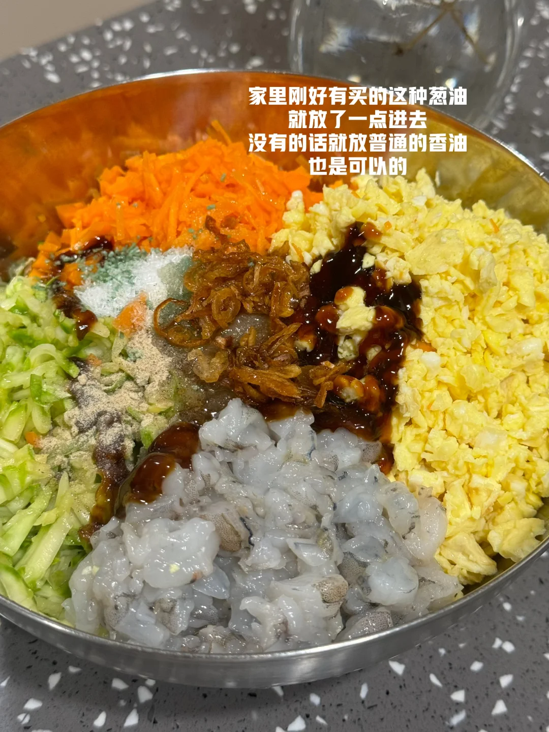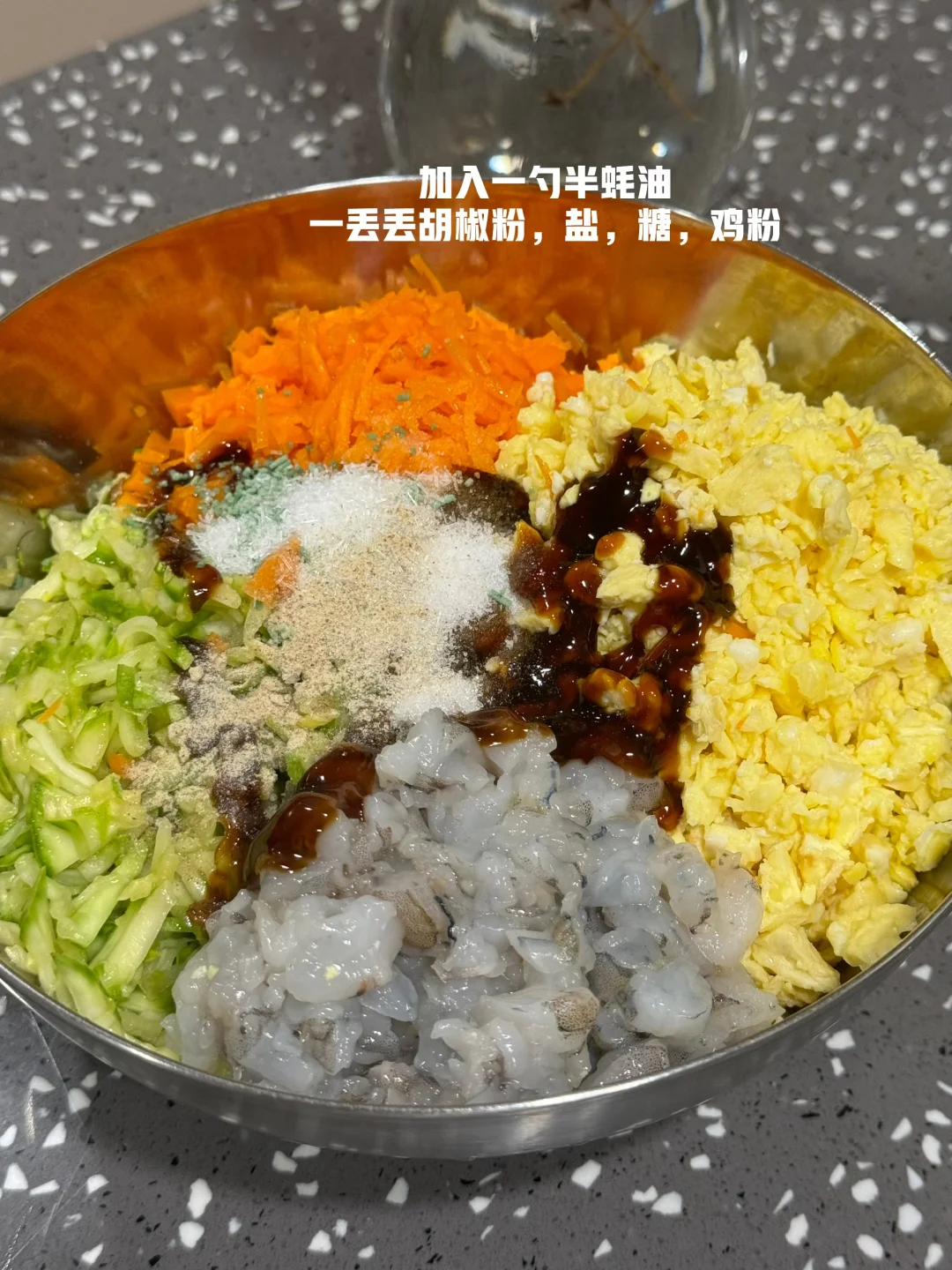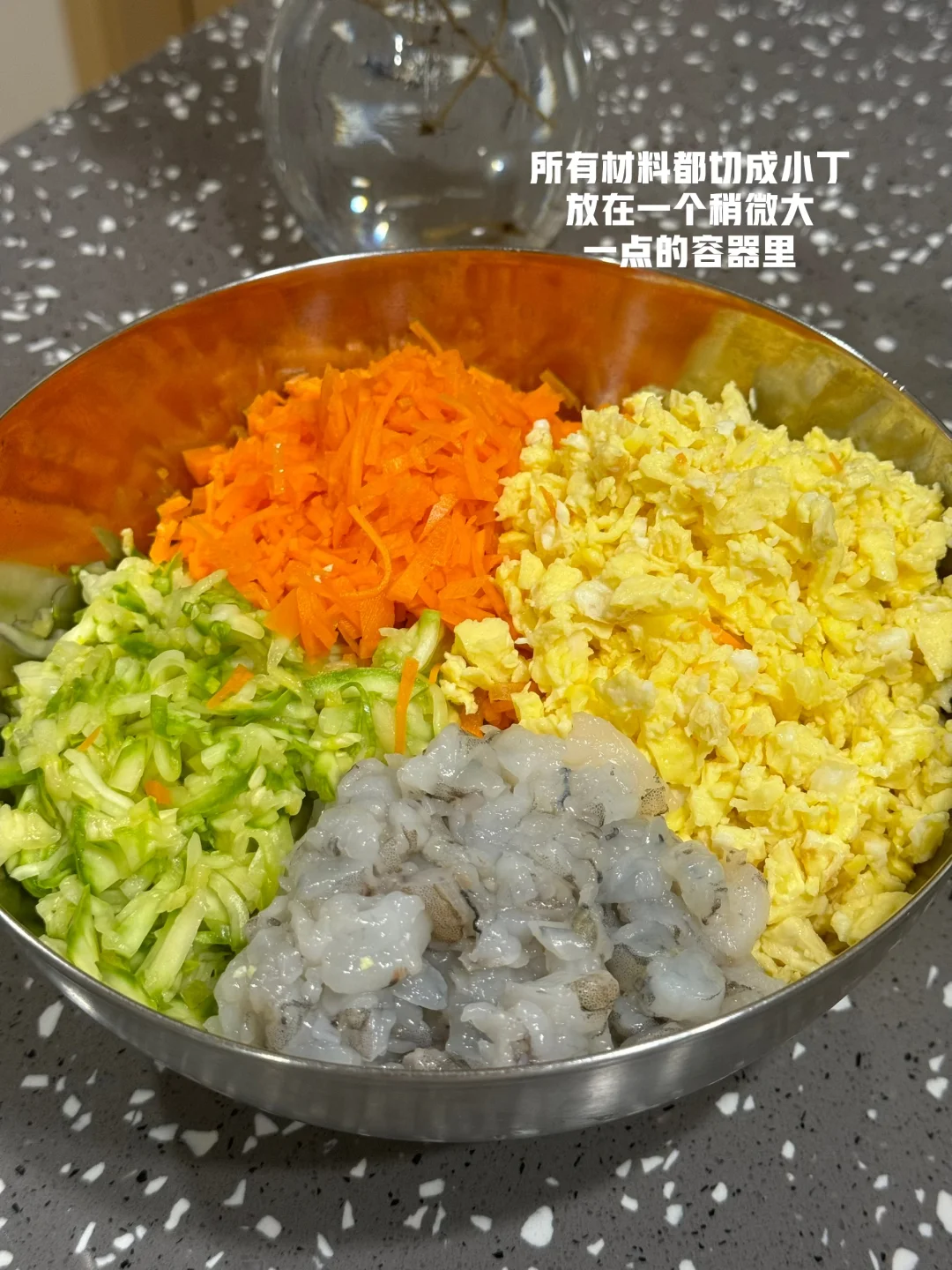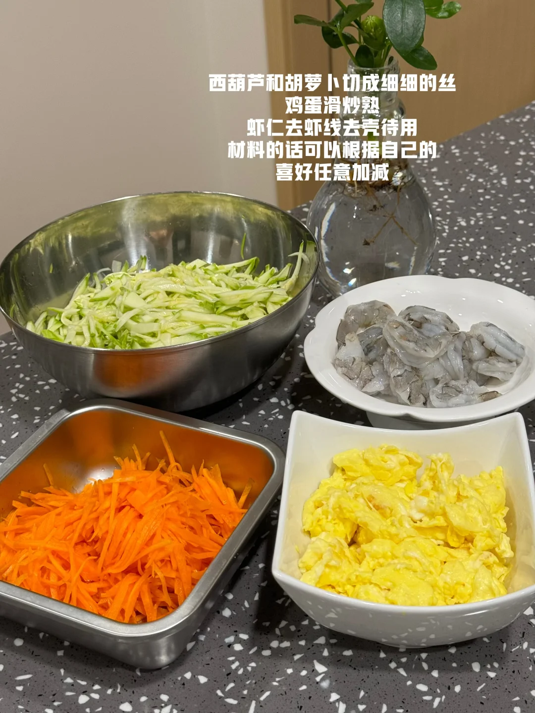 1. 西葫芦和胡萝卜切成细细的丝鸡蛋花炒熟虾仁去虾线去壳待用材料的话可以根据自己的喜好任意加减