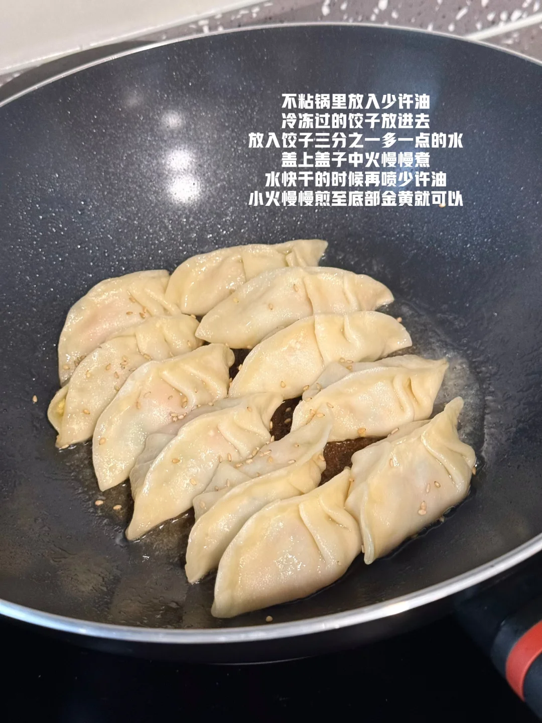 8. 不粘锅里放入少许油,冷冻过的饺子放进去,放入饺子三分之一多一点的水,盖上盖子中火慢慢煮,水快干的时候再喷少许油,小火慢慢煎至底部金黄就可以