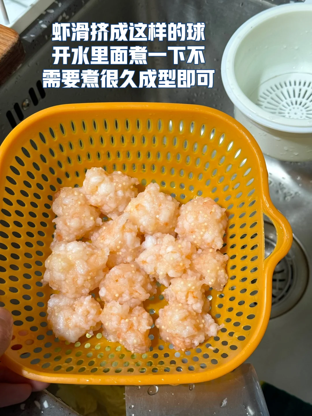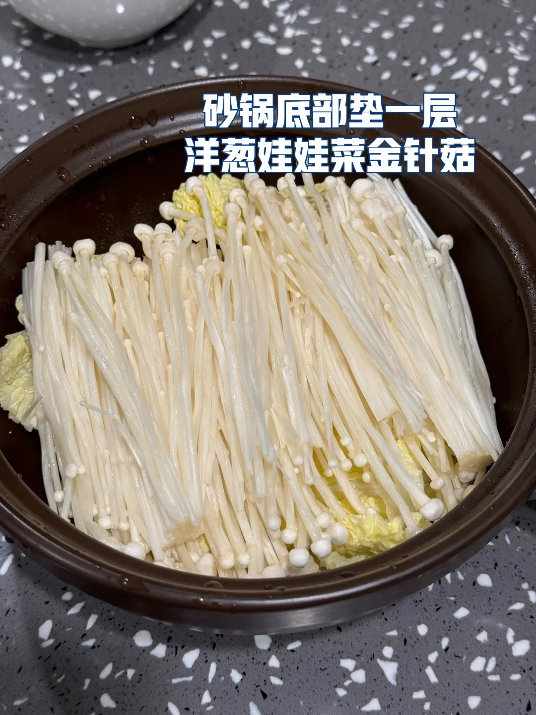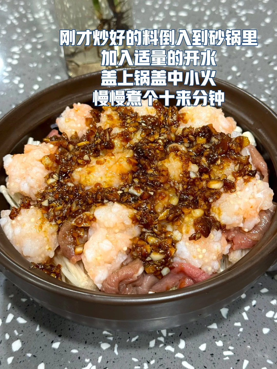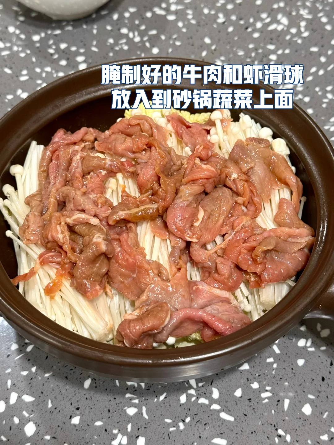 1. 砂锅底部垫一层洋葱娃娃菜金针菇 2. 虾滑挤成这样的球开水里面煮一下不需要煮很久成型即可 3. 牛肉的话你们用牛肉卷也可以,我这里用的是牛里脊放了一丢丢生抽蚝油一丢丢老抽胡椒粉盐生粉一丢丢食用油抓匀腌制一会 4. 腌制好的牛肉和虾滑球放入到砂锅蔬菜上面 5. 小火爆香多一点的大蒜生姜末加入生抽老抽蚝油盐糖鸡粉调味 6. 刚才炒好的料倒入到砂锅里加入适量的开水盖上锅盖中小火慢慢煮个十来分钟 7. 出锅撒少许葱花即可是不是很简单