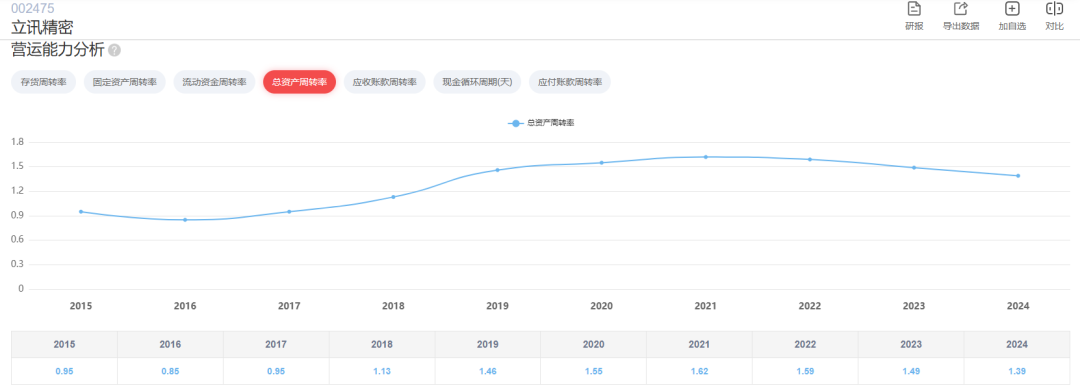 公司的总资产周转率并不高,近几年保持在1.5左右,不过在制造行业里算是较高的。