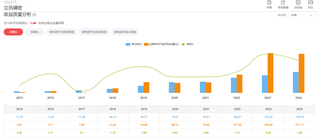 近10年公司的平均净现比为1.46,表明公司的利润含金量非常高。