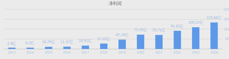 2013年公司净利润3.4亿逐的增长至2024年的133.66亿,11年时间净利润增长3831%,年化复合增长39.6%;