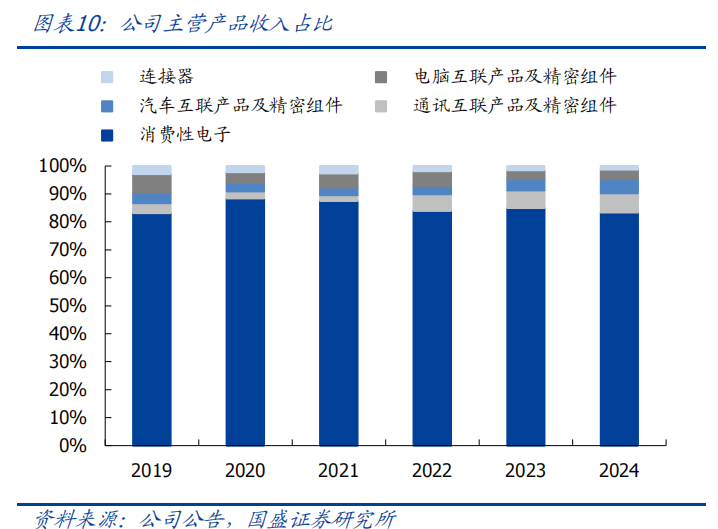 消费电子的毛利率最低,从2019年毛利率20%逐年下降至2024年的10%。