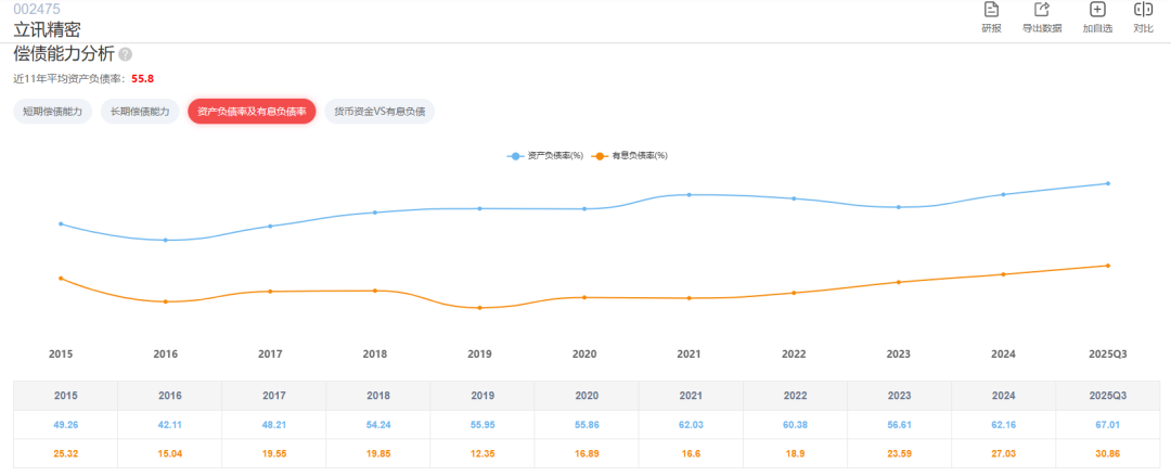 近11公司的平均资产负债率55.8%,其中有息负债率近几年呈逐年增长趋势,从2019年的12.35%逐年增长至2024年的27.03%,当前公司的有息负债率并不低。