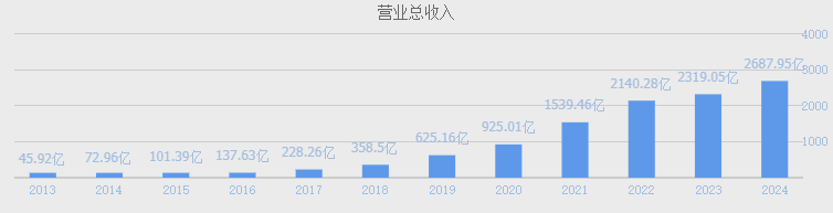 2013年公司营收45.92亿逐年增长至2024年的2687.95亿,11年时间营收增长5753亿,年化复合增长44.8%;