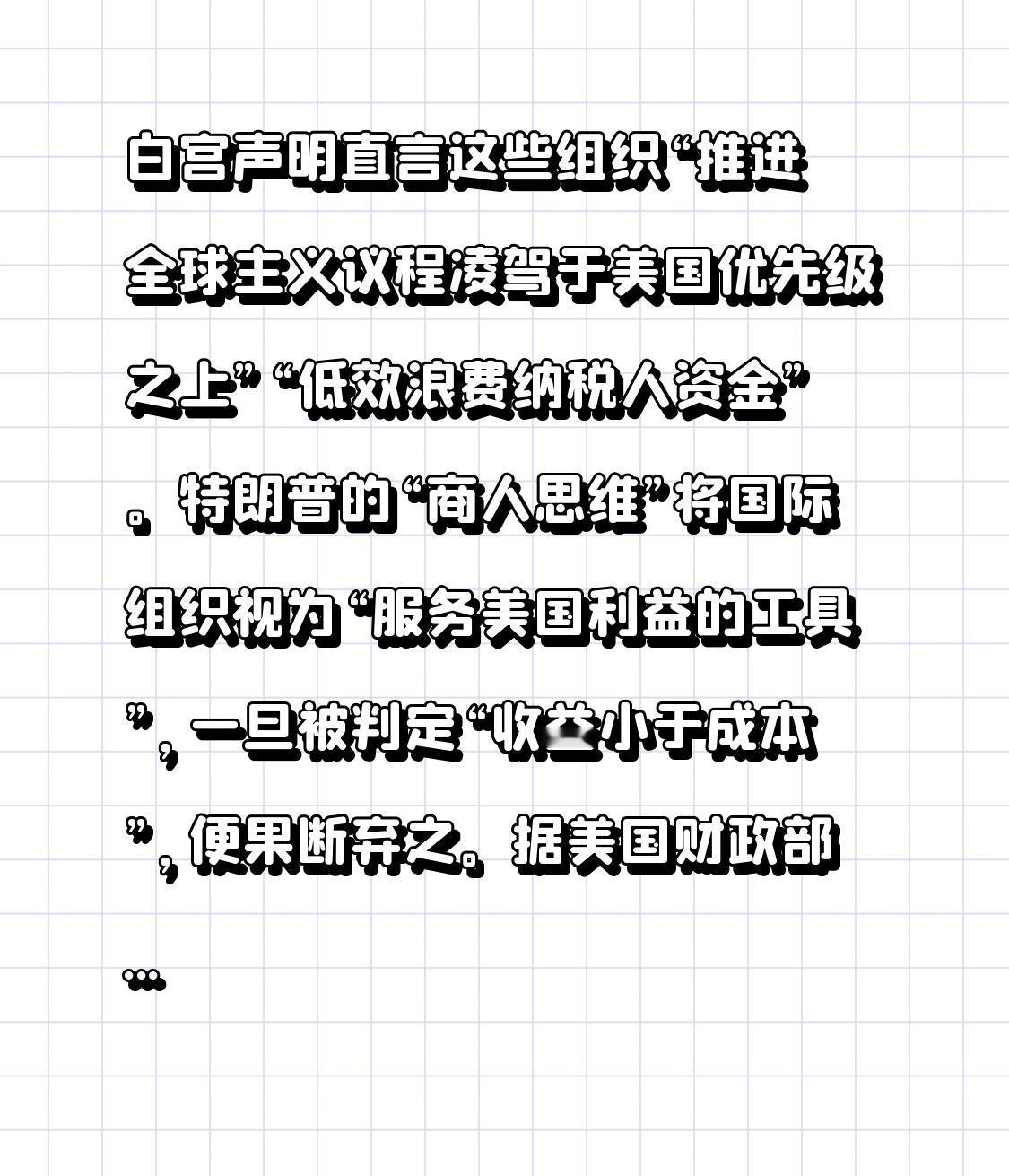白宫声明直言这些组织“推进全球主义议程凌驾于美国优先级之上”“低效浪费纳税人资金”。特朗普的“商人思维”将国际组织视为“服务美国利益的工具”,一旦被判定“收益小于成本”,便果断弃之。 据美国财政部数据,美国每年为这些组织支付的会费与援助资金超百亿美元,特朗普认为这些投入“未带来对等回报”。