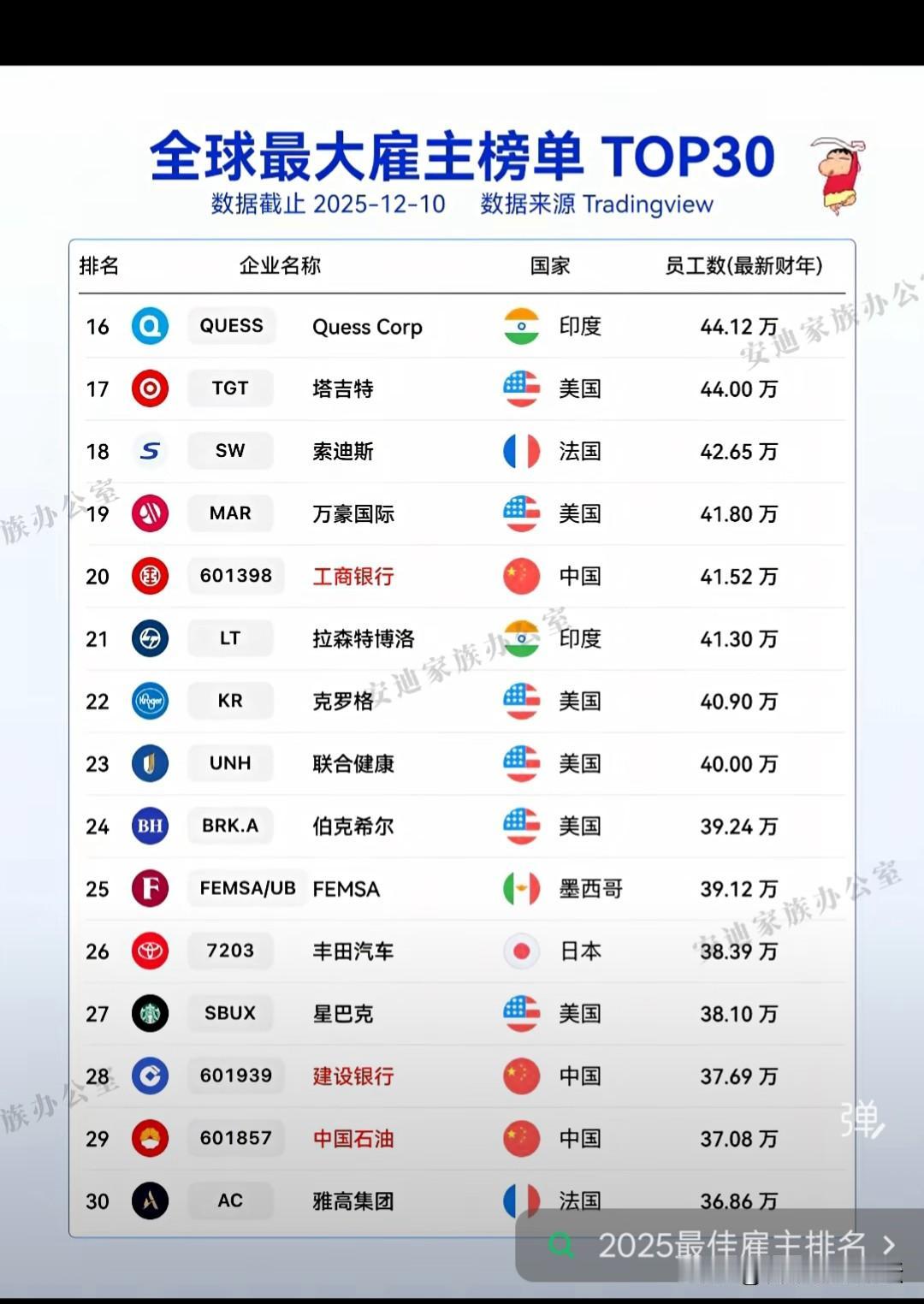 全球最大雇主。比亚迪和京东是真厉害。中国其他入选的都是行业。