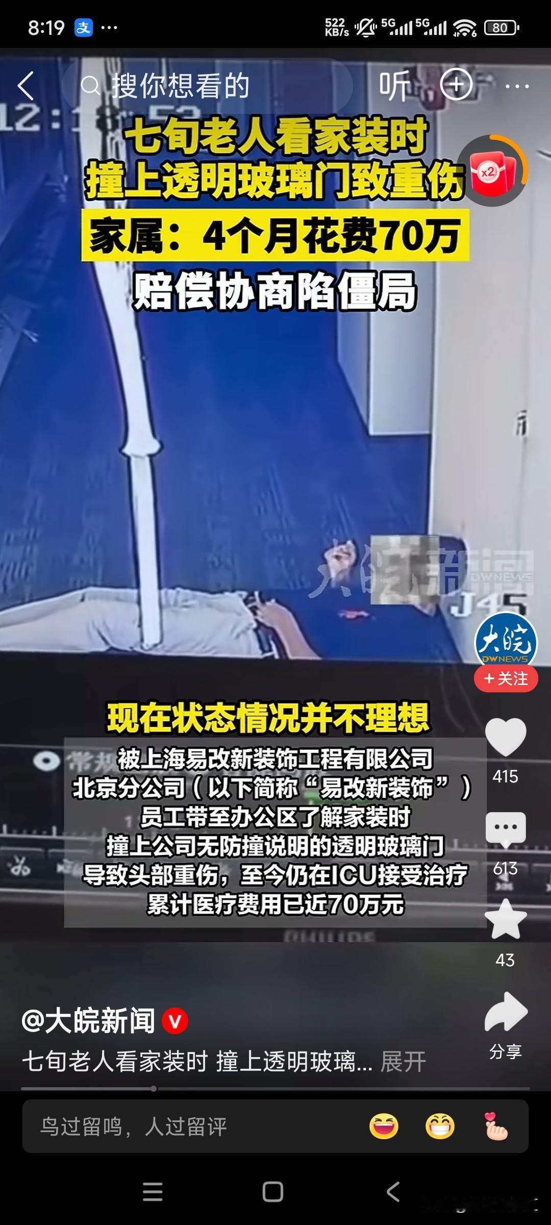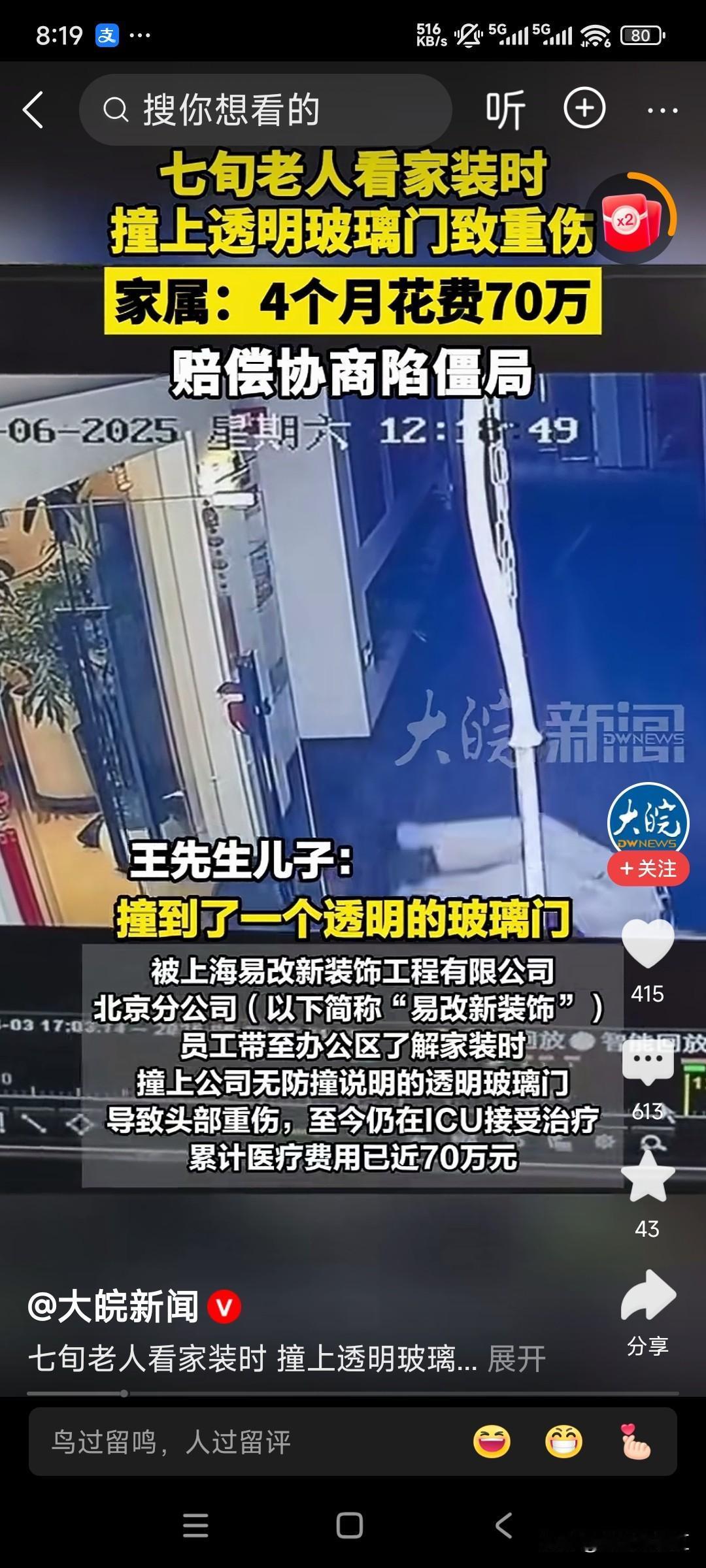这个王先生的儿子真傻! 为什么只起诉宜家呢?应该把玻璃门,还有后面的墙体一并起诉了! 事情是这个样子的,王先生到商家去看家具,在看家具的过程中,因为内急想要上厕所。但是由于厕所玻璃门擦的贼干净,所以王先生不小心撞到了玻璃门上。导致自己被弹开,然后倒地,后脑应该撞到了墙体。 然后住进了ICU,据说已经花了70万了。 这个王先生的儿子起诉商家的理由是厕所门口的灯光太暗,才导致了他的父亲摔倒撞门,然后撞墙。 对于这件事你们怎么看呢?责任到底在谁呢?受伤纠纷 宜家 宜家家居 宜家家居店 宜家商业逻辑 宜家价格 合肥宜家 宜家事件