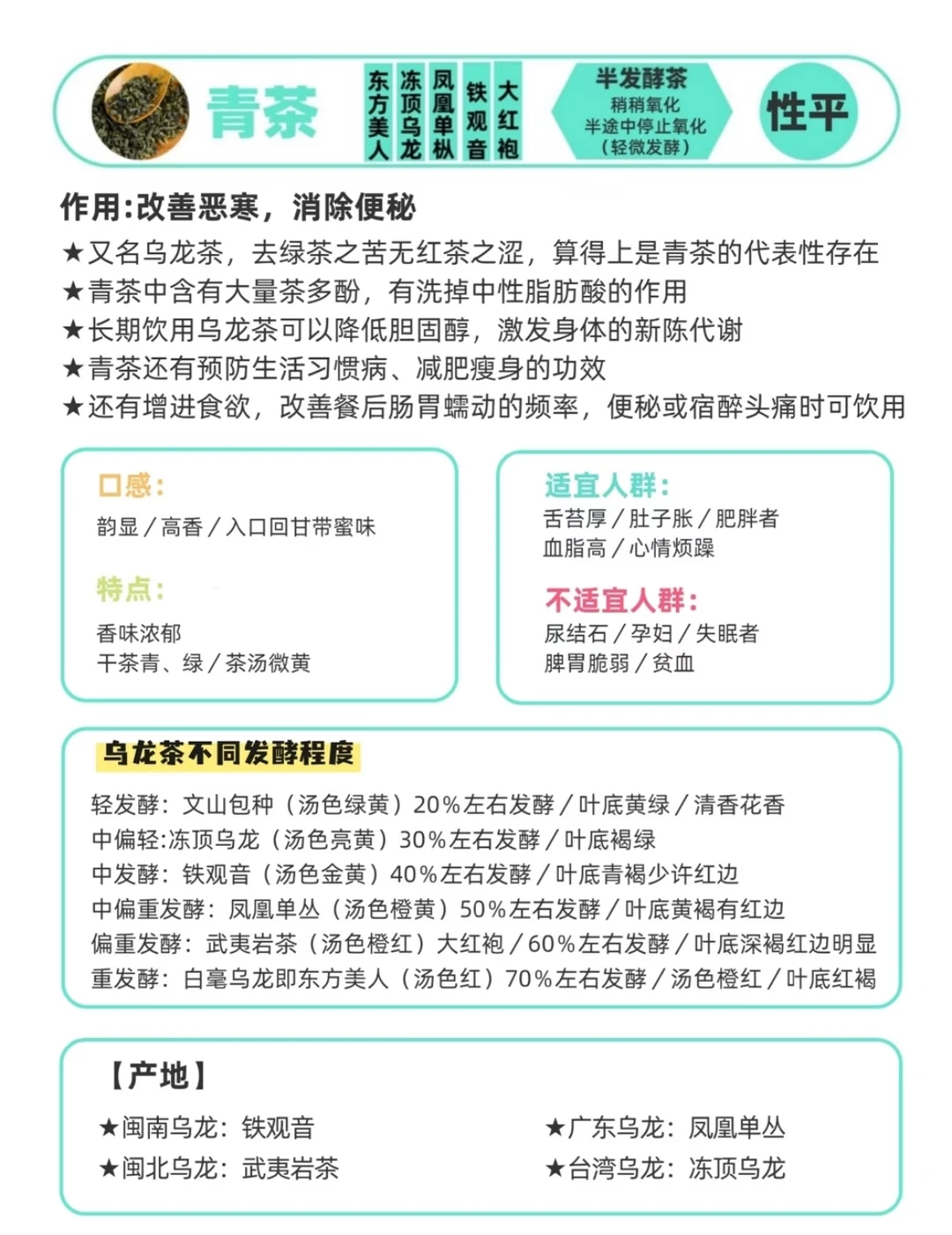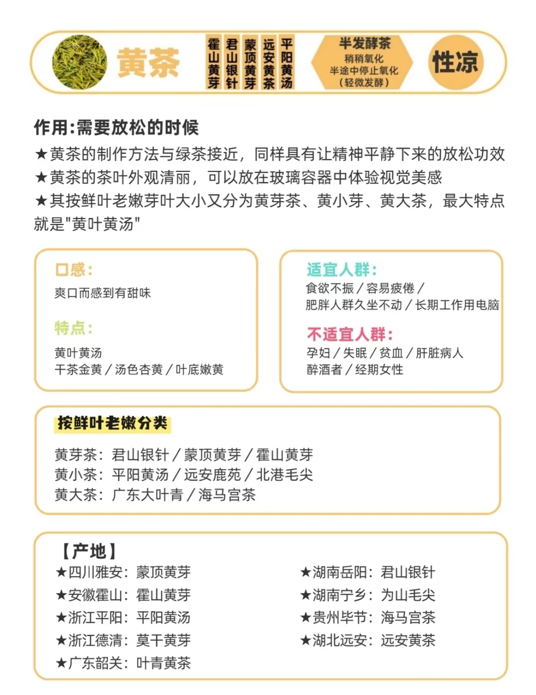 中国茶文化源远流长,七大茶系各有风味,涵盖了不同的发酵程度与口感特点。 绿茶:不发酵的“鲜爽代表” 核心特征是清汤绿叶、鲜爽回甘,保留了茶叶最原始的鲜香,几乎不含咖啡因,喝起来清爽不厚重。 制作工艺很简单,主要是采摘后快速杀青(锁住新鲜)、揉捻、干燥,不经过发酵环节,最大程度保留茶叶本身的营养。 白茶:轻微发酵的“清甜派” 核心特征是毫香蜜韵、清甜醇爽,茶汤偏浅黄,喝起来有淡淡的花蜜香,口感柔和,不苦不涩。 制作工艺极简,无需杀青,只需采摘后萎凋(自然晾干)、干燥,让茶叶轻微发酵,属于“天然养生茶”。 黄茶:轻发酵的“温润担当” 核心特征是黄叶黄汤、温润甘甜,口感介于绿茶和白茶之间,比绿茶柔和,比白茶更醇厚,自带淡淡的兰花香。 制作工艺在绿茶基础上多了一步“闷黄”,通过轻微发酵去除茶叶的青涩感,让口感更温润。 青茶(乌龙茶):半发酵的“香韵王者” 核心特征是香高味醇、回甘强劲,兼具绿茶的清香和红茶的醇厚,茶汤橙黄明亮,香气层次丰富(兰香、桂香、蜜香都有)。 制作工艺相对复杂,需经过萎凋、做青、杀青、揉捻、烘焙,发酵程度适中,既保留鲜香又激发醇厚口感。 红茶:全发酵的“醇厚暖饮” 核心特征是红汤红叶、醇厚甘甜,口感温润醇厚,没有苦涩感,自带蜜香或薯香,喝起来暖身又养胃。 制作工艺主要是萎凋、揉捻、发酵、干燥,让茶叶完全发酵,转化出温润的口感,咖啡因含量较低。 黑茶:后发酵的“陈香大佬” 核心特征是黑褐油润、陈香浓郁,茶汤深红浓厚,口感醇厚顺滑,越陈越香,自带独特的陈味和枣香、菌香。 制作工艺需经过杀青、揉捻、渥堆(人工发酵)、干燥,发酵时间长,茶叶中的物质充分转化,温润养胃。 花茶:窨制的“香氛茶品” 核心特征是花香浓郁、清甜爽口,以茶叶为基底,融入鲜花的香气,茶汤清香淡雅,喝起来自带花香,颜值和口感双在线。 制作工艺是“窨制”(将茶叶和鲜花混合,让茶叶吸收花香),不经过发酵,保留茶叶的清爽和鲜花的芬芳。