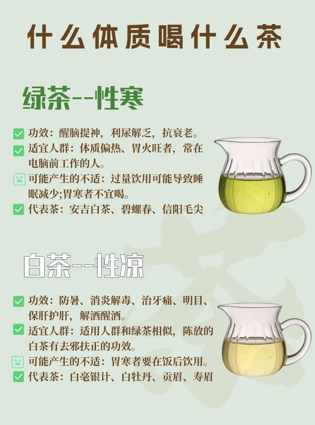 1. 绿茶(性寒):适合热体质、胃火盛、久坐电脑前的人|胃寒者忌饮,过量影响睡眠