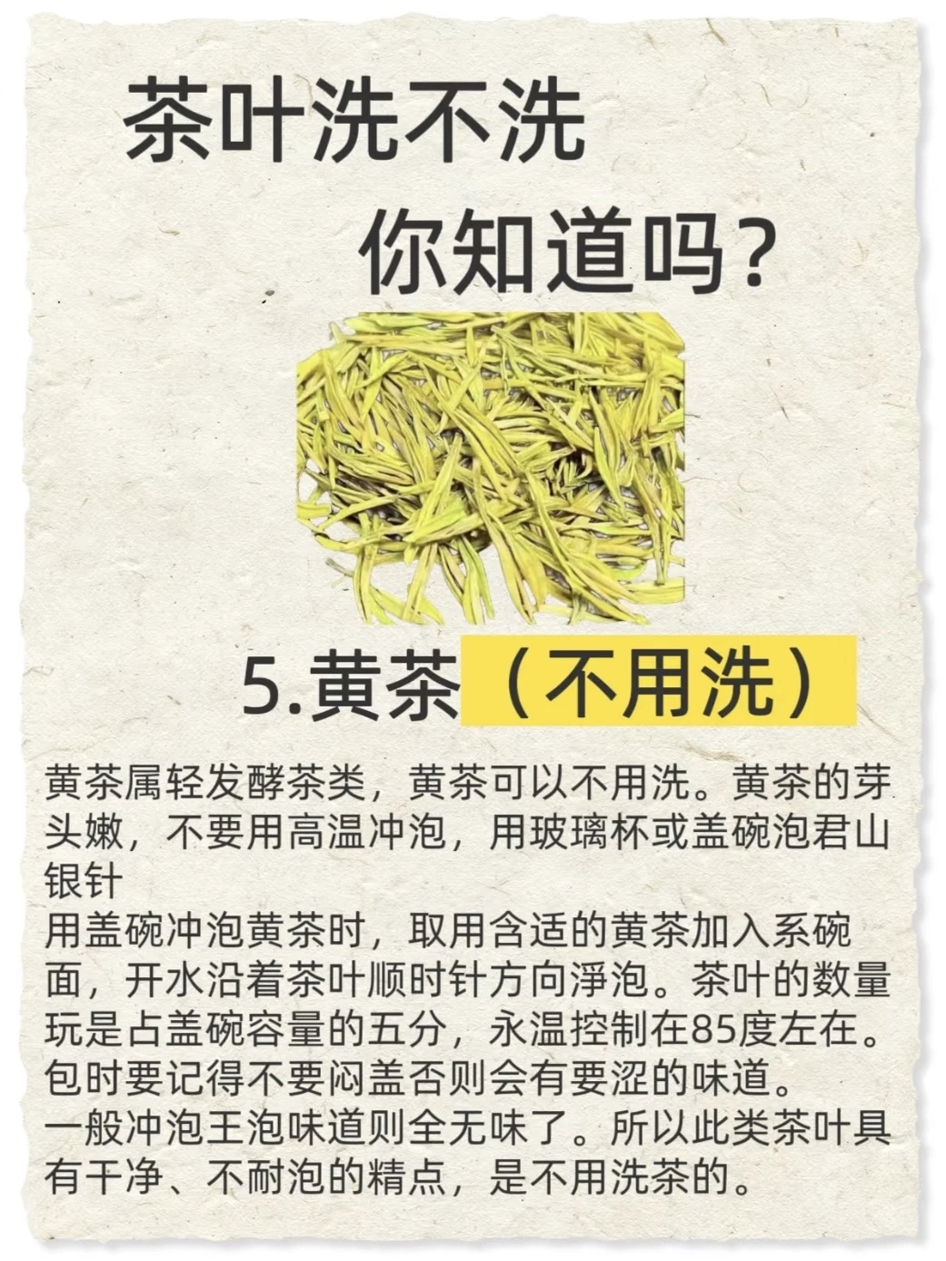 黄茶:无需洗茶。黄茶的工艺和绿茶相近,同样以鲜爽甘甜见长,茶叶鲜嫩无杂质,洗茶会损失核心风味,直接冲泡就能品到它的独特韵味。