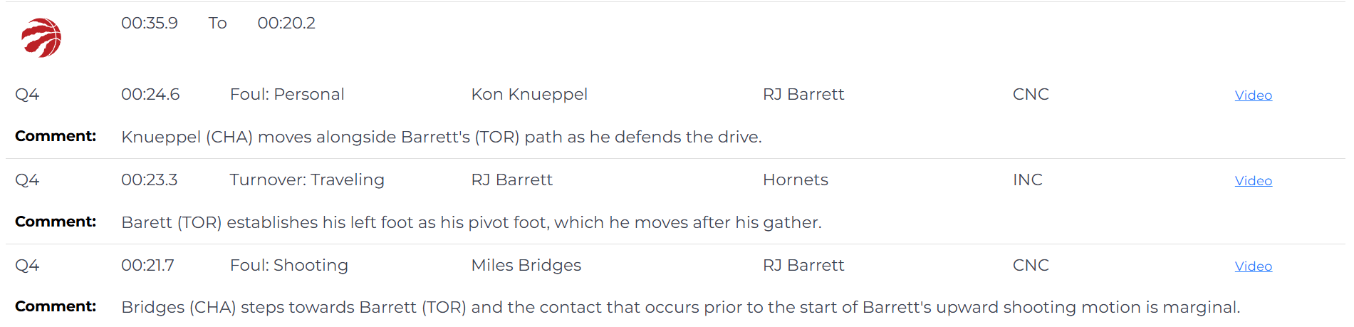 比赛最后23.3秒,裁判漏吹了RJ-巴雷特的走步违例,巴雷特将左脚作为中轴脚,但在合球后移动该脚。