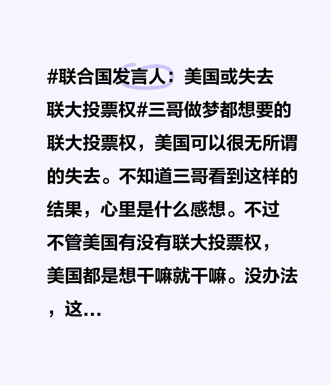 不过不管美国有没有联大投票权,美国都是想干嘛就干嘛。没办法,这就是实力给的底气。
