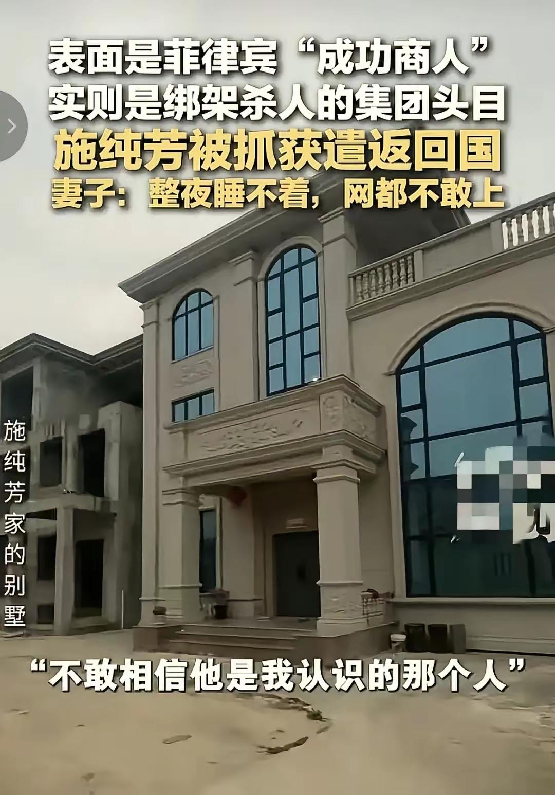 刚抓回来的这个福建晋江家伙施纯芳,40岁,在菲律宾混了20多年,表面上看是正经做纺织生意的成功老板,还当上了当地华人商会的创会会长,高调捐款办活动,风光得很。他背地里带着团伙专门盯上同胞下手,用投资合作或高薪工作的幌子把人骗过去,绑架后狠要赎金,就算钱到手了也直接撕票,涉及好几起恶性案件,害得多家受害者家庭家破人亡。 中菲警方联手追了他两年多,终于在2025年12月把他从藏身的地方揪出来,12月22日直接押上飞机遣返回国。 说白了,施纯芳的“成功人士”人设全是精心伪装。留着一溜羊胡须的他,2022年当上菲律宾中国商会黎刹省分会创会会长,2024年又扛起菲律宾国际纺织面料行业协会大旗,公开场合满口“为同胞争光” 。可在老家晋江宜富寮村,村民对他印象模糊,只记得他疫情时捐过1000块,所谓“捐建学校”纯属张冠李戴 。 更讽刺的是,这层“侨领”外衣成了他作恶的保护伞。他利用商会身份积累的信任,专门筛选想出海淘金的同胞,用“高回报投资”“跨国高薪岗”画饼。公安部通报明确,其团伙作案手段残忍,赎金到手后从无放人先例,涉案多起命案且社会影响恶劣 。 回头看,这场跨国追缉藏着太多不易。早在2024年,福建晋江警方就已对他发出逮捕令,注销其护照使其成为非法居留者,2025年更是将其列入移民黑名单和监控名单 。中菲警方克服地理隔阂与信息壁垒,耗时两年多终于锁定其在黎刹省泰泰镇的藏身地,周密布控后一举抓获。 施纯芳落网后,曾经捧他的菲律宾中国商会火速“切割”,声明其“伪装隐蔽”“早已非会员”。他那栋在老家刚建好的三层别墅,如今大门紧闭、入夜无灯,隔壁为姐姐修建的别墅也彻底停工,只剩裸露的红砖诉说着这场骗局的落幕 。他的妻子至今不敢相信,那个口口声声“做生意”的丈夫,竟是双手沾满同胞鲜血的恶魔。 跨国犯罪从来都逃不过正义的眼睛,中菲执法合作的重拳已经砸下。可在海外,类似的“伪善同胞”骗局仍偶有发生,我们该如何擦亮眼睛防范?你身边有没有听过类似的海外避险故事?