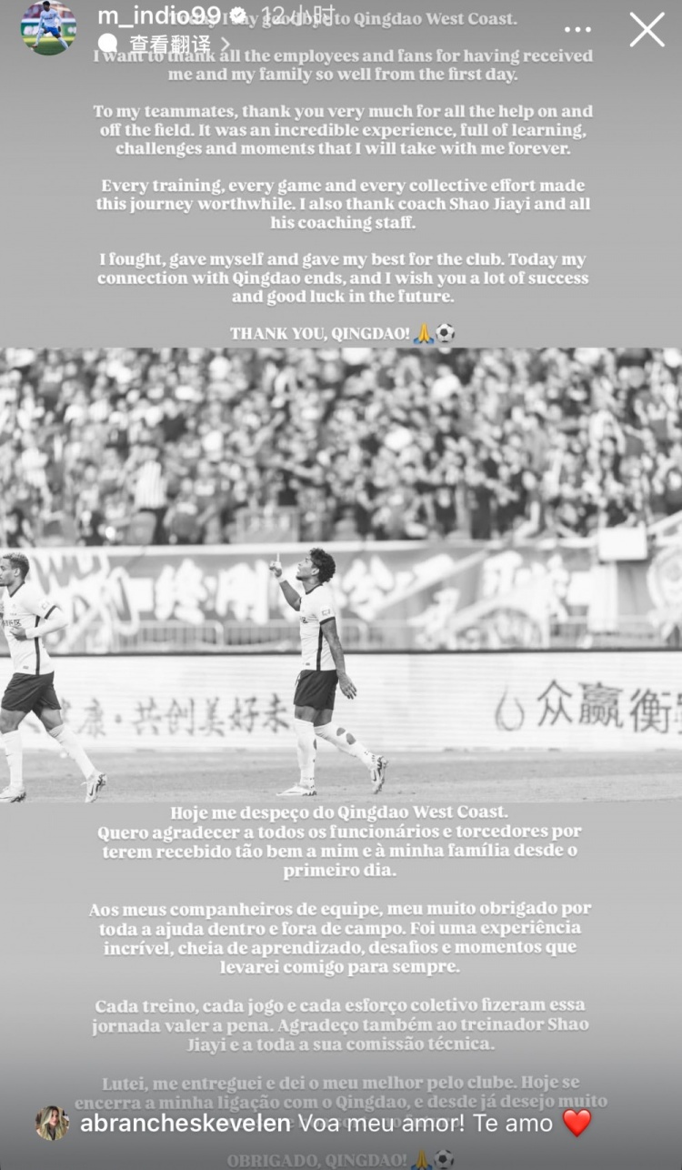 直播吧1月9日讯在青岛西海岸效力了一个半赛季的巴西中场球员马特乌斯更新社媒,向青岛西海岸告别。