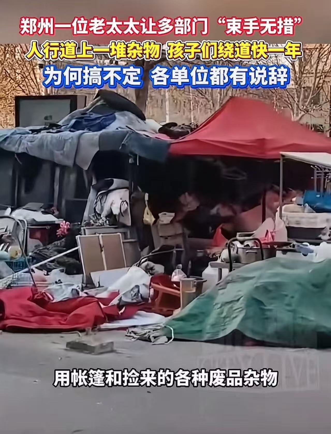 郑州,一位老太太竟然让多个部门束手无策!老太太用帐篷和捡来的各种废品杂物长期占据