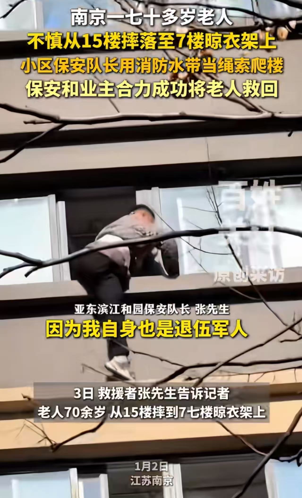 “一个月就挣几千块钱,却干着拿命去拼的事!”南京,一位70多岁老人不慎从15楼坠落,卡在7楼的晾衣架上,命悬一线。千钧一发之际,小区保安队长挺身而出,用一根消防水带当“救命绳”,徒手攀爬救人。而他之所以敢这么做,是因为他还有一个特殊身份!