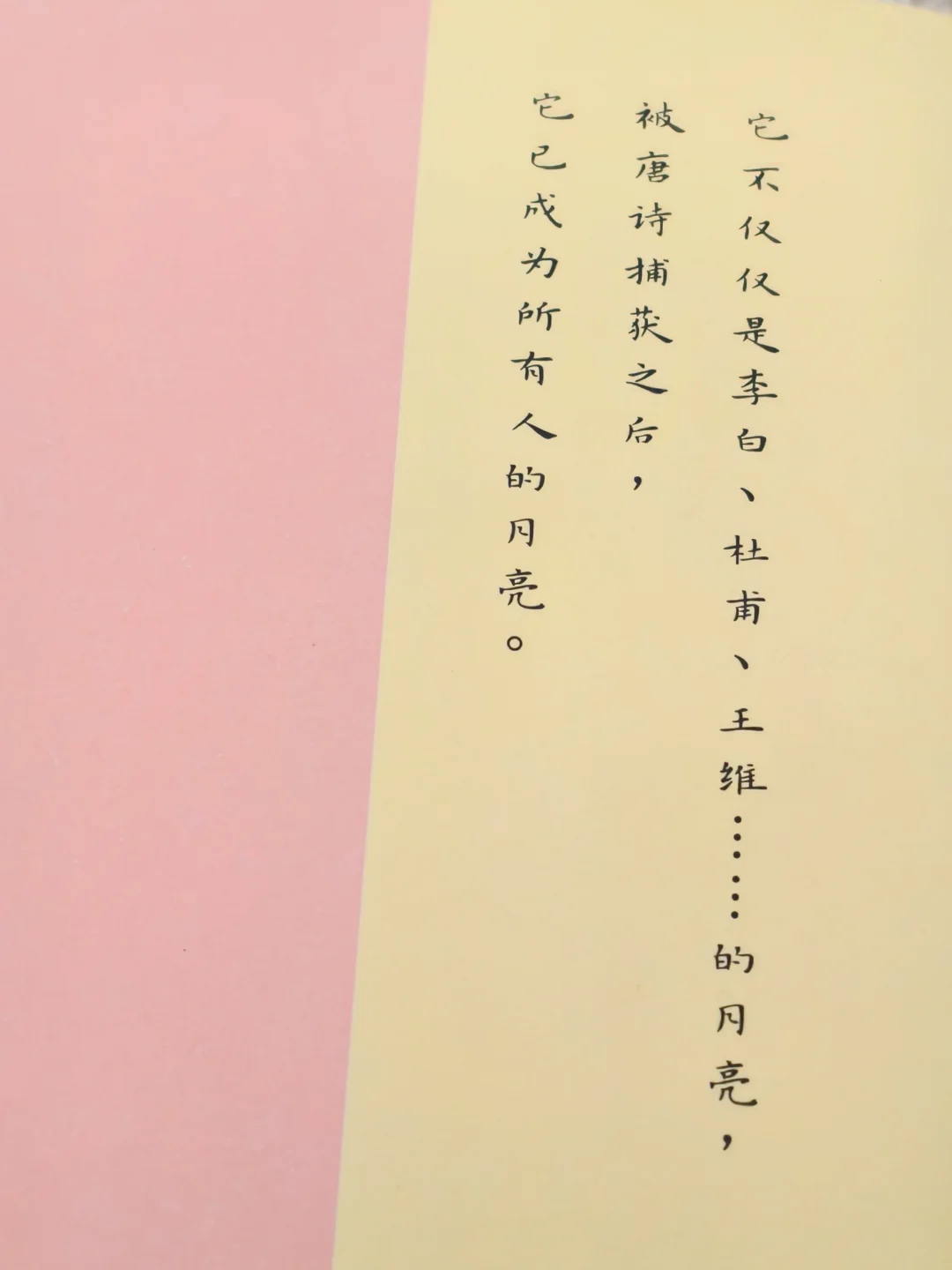书的封底有一句话:“它不仅仅是李白、杜甫、王维...的月亮,被唐诗捕获之后,它已成为所有人的月亮。”这句话道出了全书的灵魂。