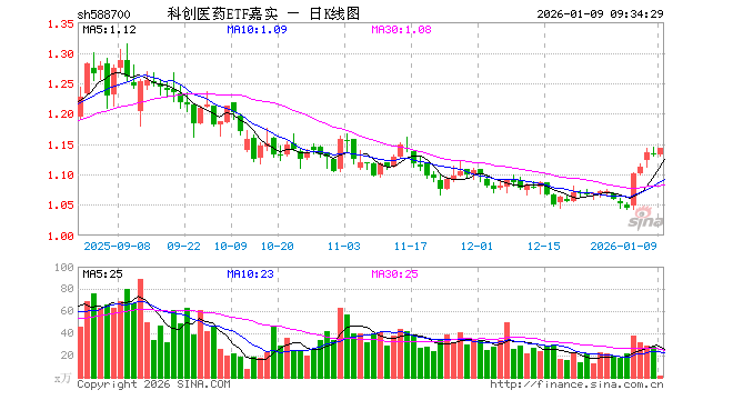 1月9日,科创医药ETF嘉实(588700)开盘跌0.18%,报1.132元。科创医药ETF嘉实(588700)重仓股方面,联影医疗开盘涨0.79%,百济神州跌1.21%,百利天恒跌0.11%,惠泰医疗涨1.17%,艾力斯跌0.22%,君实生物跌0.03%,泽璟制药涨0.77%,荣昌生物涨0.65%,博瑞医药跌0.02%,华大智造涨0.00%。