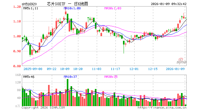 1月9日,芯片50ETF(516920)开盘跌0.88%,报1.121元。芯片50ETF(516920)重仓股方面,中芯国际开盘跌0.77%,寒武纪跌1.66%,海光信息跌1.52%,北方华创跌0.72%,澜起科技跌0.82%,兆易创新跌1.62%,中微公司跌3.89%,豪威集团涨0.00%,芯原股份跌0.06%,长电科技涨0.69%。