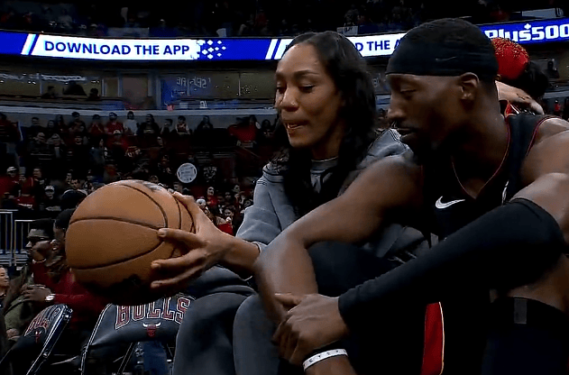 场上球员都在热身投篮,阿德巴约和现场观战的女朋友阿贾-威尔逊场边“秀恩爱”。