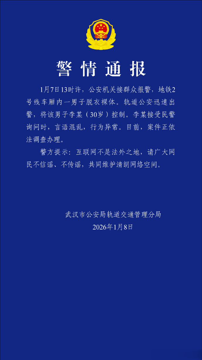 1月8日,武汉地铁公安通报“2号线车厢内一男子脱衣裸体”:李某言语混乱、行为异常,案件正依法办理。