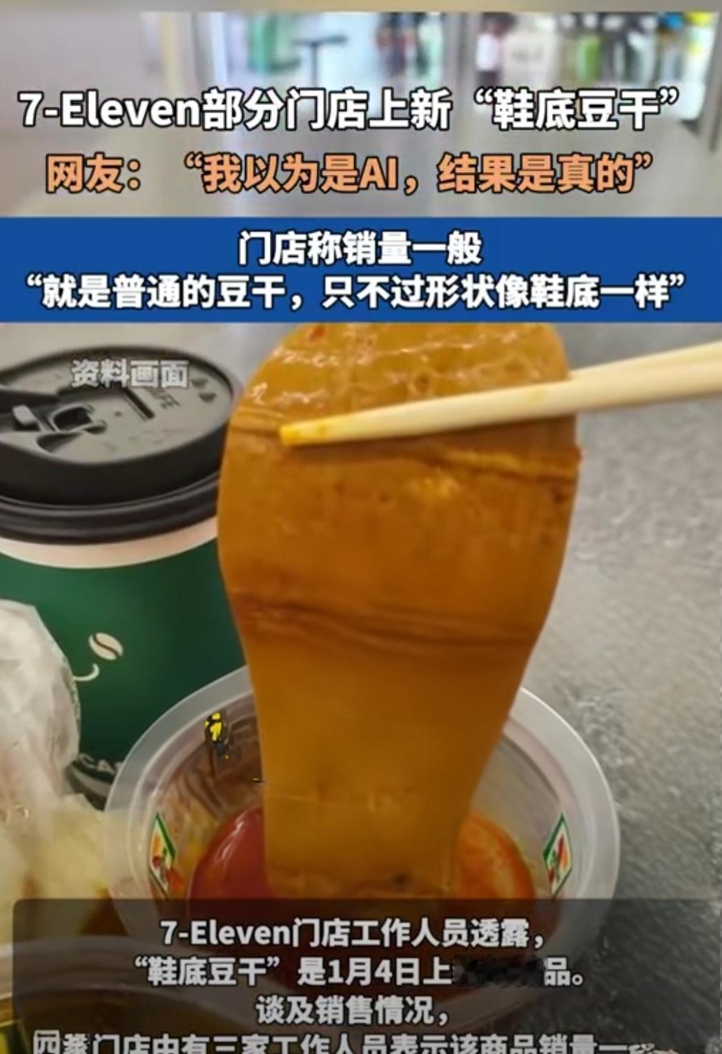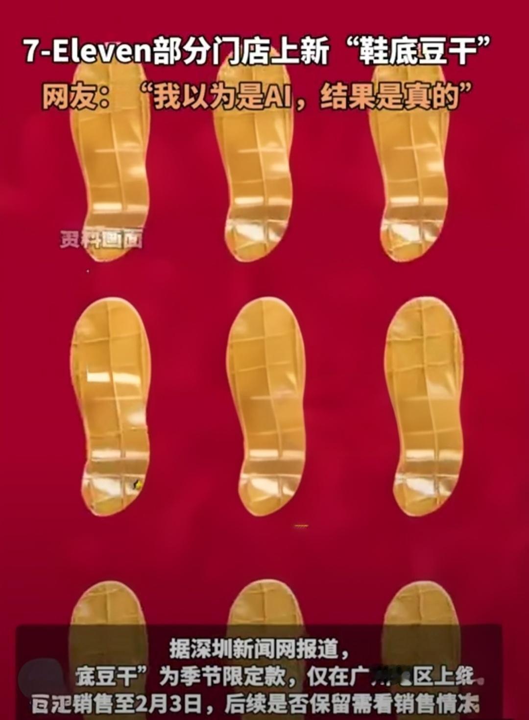 广东7-Eleven这波操作也太敢了!新出的关东煮“鞋底豆干”直接把网友看懵,刷到视频的人都在喊:“以为是AI瞎编的,没想到真能买到”! 这豆干长得是真传神,长方形的薄片状,边缘还带着点弧度,活生生就是缩小版的鞋底。更逗的是它还分“鞋码”,16厘米和24厘米两款,售价2.5元和3元,妥妥的“大小脚适配”。不过店员说了大实话:味道就是普通卤豆干,没别的花样,全靠外形博眼球。 网友的吐槽快把评论区笑晕了,有人说“隔着屏幕都觉得有脚臭味”,还有人调侃“吃的时候会不会下意识蹭蹭鞋底”,甚至有人脑补“左脚豆干配右脚鱼蛋”的奇葩组合。但吐槽归吐槽,也有好奇党专门冲去门店打卡,只是不少门店反馈销量一般,主要是煮在关东煮锅里辨识度太低,没人敢轻易尝试。 其实这两年食品界都在玩“抽象营销”,靠猎奇外形吸流量,但能不能留住消费者还得看实力。这款豆干赢了话题度,却输在了“颜值劝退”,毕竟吃东西讲究色香味,外形太出戏难免影响食欲。品牌方也说了,1月卖完就看情况决定是否保留,能不能留下来全看吃货们给不给力。 你愿意为这份猎奇买单,去尝尝“鞋底豆干”吗?