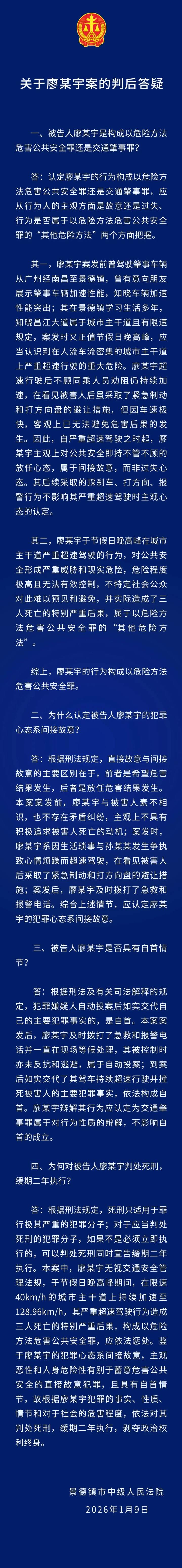 1月9日上午,江西省景德镇市中级人民法院对廖某宇以危险方法危害公共安全案进行宣判。