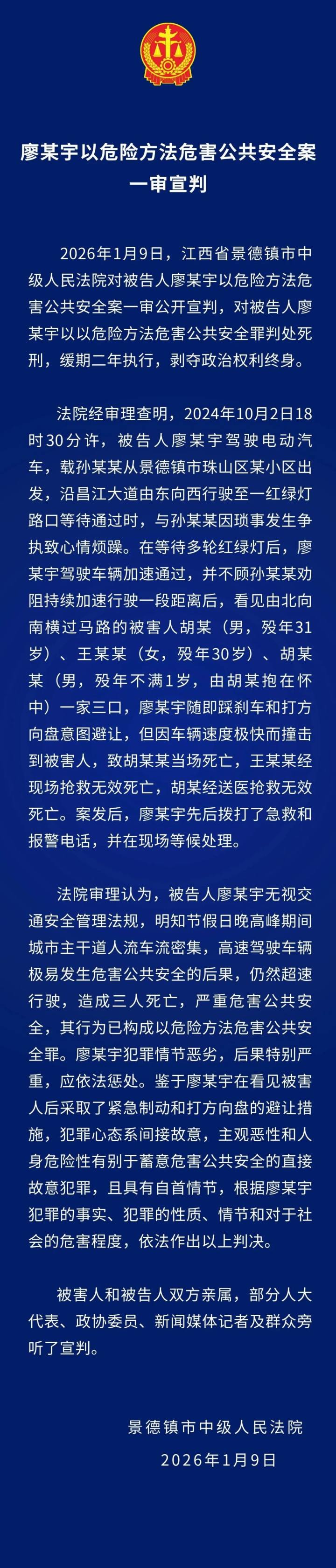 景德镇一家三口被撞身亡一审宣判,廖某宇以危险方法危害公共安全案一审被判死缓