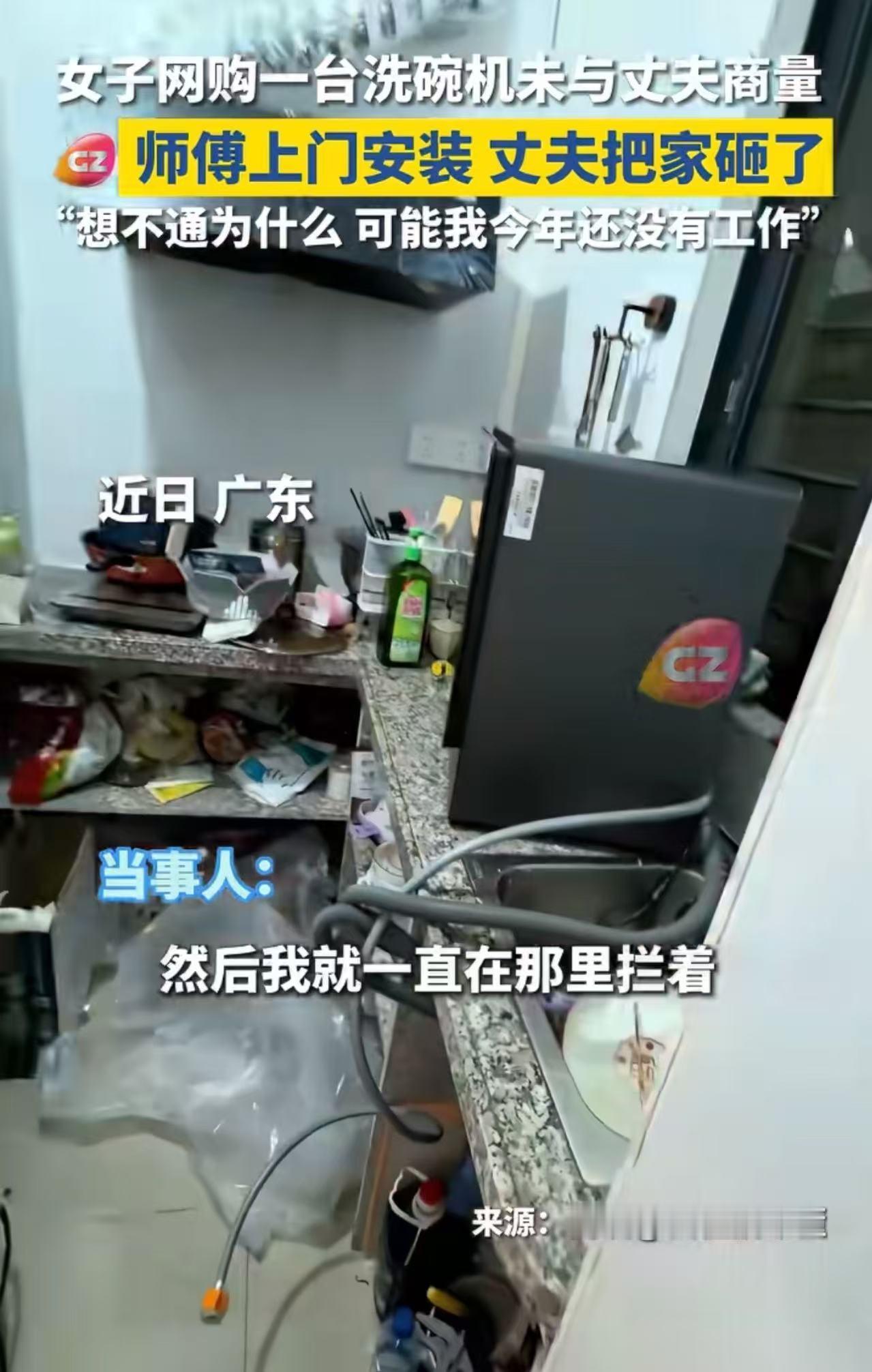 广东,女子网购一台洗碗机未与丈夫商量,师傅上门安装时,丈夫把家砸了。女子发视频哭诉:“想不通为什么,可能我今年还没有工作吧……”网友:他接受得了洗碗机,接受不了一个没工作天天在家连碗都懒得洗的人…… 女子和丈夫在广东租房生活,有两个年幼的孩子,所以她全职在家带娃、做饭。尤其一到饭后,面对一堆油腻的锅碗瓢盆,还要用冰凉的冷水冲洗,手都裂了口子。看 她看到网上不少宝妈都在用洗碗机,她心动了,觉得这能省点力气、护住她柔嫩的双手。 于是,她用手机下单了一台洗碗机,全程没跟丈夫商量。 机器到货后,丈夫才知道这事。 他当场脸色铁青:“你买这么贵的东西,连问都不问我一句?退掉吧!” 但女子不仅没退,还申请了师傅上门安装。 眼看师傅来到家里,丈夫火气彻底压不住,冲过去吼道:“别装了!给我停下!” 女子怕两人起冲突,赶紧挡在厨房门口,催师傅快点装完走人。 这一举动彻底激怒丈夫——他转身冲进客厅,抄起东西就砸! 茶几掀翻、杯子碎了一地,墙上挂画也被扯下来……一片狼藉。 安装师傅吓得赶紧收拾工具跑路,离开这是非之地。 女子看着家里一片狼藉,又委屈又茫然,把视频发到网上,哽咽着说: “我想不通他为什么不让我装,他一个月工资保底8000,加上提成有一万多一个月,可能是我今年还没上班吧……” 此事引发热议,有网友说,估计老公压力也大,在广东一万的收入根本不多,而且老婆又没工作,洗碗完全可以自己洗,洗碗机也算高消费,理应跟老公协商,当然老公的做法也有些偏激了。 也有网友说,这种男人就是窝里横!不舍得给老婆买洗碗机,就自己洗碗啊!带两个孩子多辛苦啊!在某些男人心里,妻子的劳动没有价值,只有他的工资才是“真金白银”。他可以接受妻子全年无休地带娃、做饭、洗衣、打扫,却无法接受她花“他的钱”买一台减轻负担的机器——因为在他潜意识里,家务是女人“白干”的义务,而工资才是他“养家”的功劳。 还有网友说,男人上班还要洗碗?女人闲着在家啥都不干,亏你说的出来?洗碗机只是导火索,冰冻三尺非一日之寒!洗个碗花得了几分钟,没工作的话先把厨房卫生搞干净点,年纪轻轻太懒了。 我觉得别急着骂丈夫“窝里横”,先想想:当一个人独自扛起全家生存重担时,他最怕的不是花钱,而是失去对生活的掌控感。 这位丈夫的问题或许在于情绪管理,但他愤怒的根源,是被剥夺了“共同决策权”。 婚姻不是“你负责赚钱,我负责花钱”,而是两个人在有限资源下,一起权衡、妥协、规划未来。 妻子觉得“洗碗太累”可以理解,但解决方式不该是绕过伴侣、单方面消费。 真正成熟的爱,是在提需求之前,先问一句:“我们现在能负担吗?你觉得呢?” 支持丈夫,不是支持暴力,而是支持“责任应被尊重”的底线。 你可以心疼全职妈妈的辛劳,但也请看见那个在外咬牙硬撑、不敢倒下的男人。 真正的体谅,从来不是“我想买你就该给”,而是“我知道你难,所以我愿意一起省、一起扛”。
