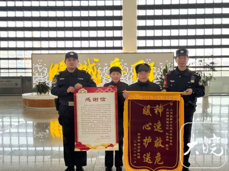 大皖新闻讯在第六个警察节来临之际,一份特殊且温暖的“节日礼物”温暖着民警们的心。1月8日,一名80岁旅客和家人专程携带锦旗和感谢信,送到正在阜阳西站站内巡逻的民警阮圣坤的手上,以此致谢他去年10月份的及时救助。