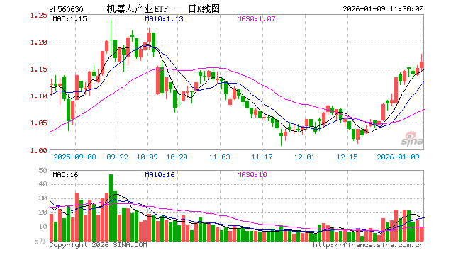 1月9日,截止午间收盘,机器人产业ETF(560630)涨1.04%,报1.162元,成交额1071.19万元。机器人产业ETF(560630)重仓股方面,汇川技术截止午盘涨0.23%,科大讯飞涨0.71%,石头科技涨0.24%,大华股份涨0.47%,中控技术涨0.64%,大族激光涨6.26%,双环传动涨1.14%,科沃斯涨0.17%,机器人涨0.65%,云天励飞涨0.74%。