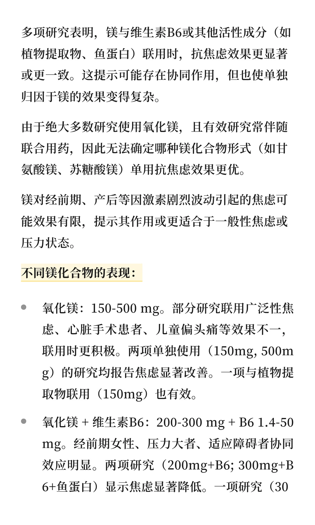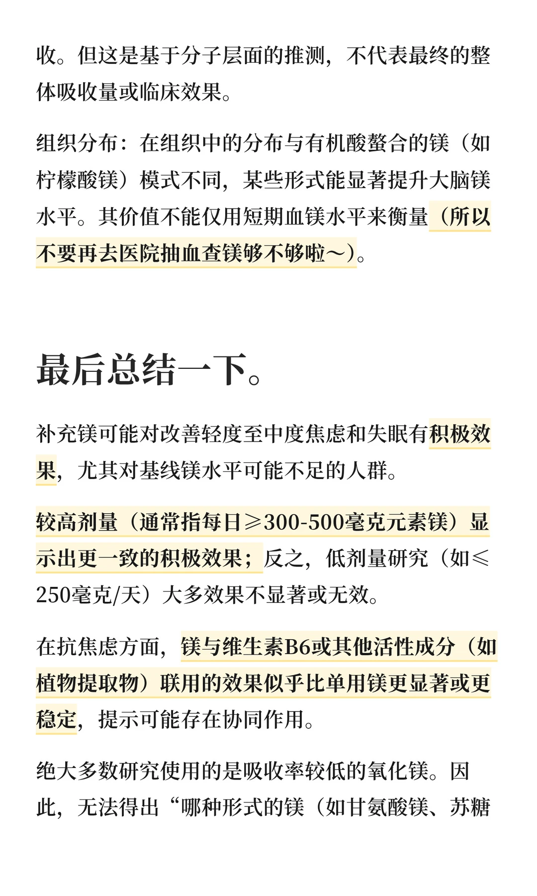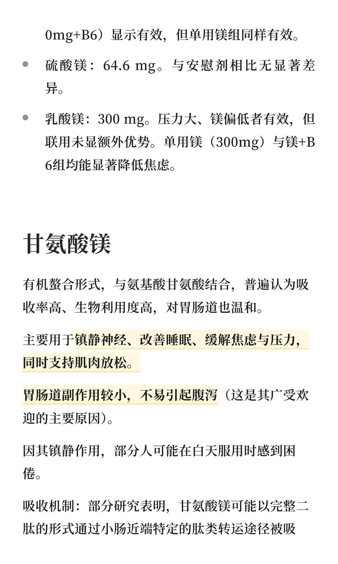 镁的形式多种多样,氧化镁可以治疗便秘,苹果酸镁可以缓解慢性疼痛,甘氨酸镁有天然的镇静作用,牛黄酸镁可以稳定血压和血糖,乳清酸镁可以支持心脏健康。不同形式的镁吸收率不同,每个人吃了它的体感也不同。